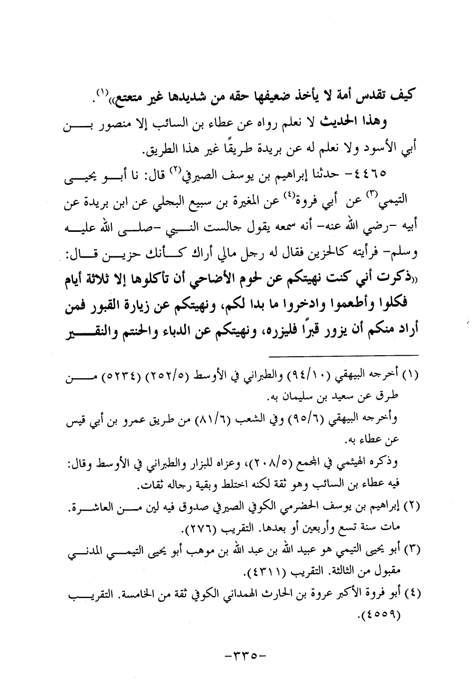 4465- حَدَّثنا إبراهيم بن يوسف الصيرفي، قَال: حَدَّثنا أَبُو يَحْيَى التَّيْمِيُّ، عَن أَبِي فَرْوَةَ عَنِ الْمُغِيرَةِ بْنِ سُبَيْعٍ الْبَجَلِيِّ، عَن ابْنِ بُرَيدة، عَن أَبيهِ، رَضِي اللَّهُ عَنْهُ، أَنَّهُ سَمِعَهُ يَقُولُ جَالَسْتُ النَّبِيّ صَلَّى اللَّهُ عَلَيه وَسَلَّم فرأيته كالحزين فقال له رجل مالي أَرَاكَ كَأَنَّكَ حَزِينٌ قَالَ: ذَكَرْتُ أَنِّي كُنْتُ نَهَيْتُكُمْ عَنْ لُحُومِ الأَضَاحِي أَنْ تَأْكُلُوهَا إلاَّ ثَلاثَةَ أَيَّامٍ فَكُلُوا وَأَطْعِمُوا وَادَّخِرُوا مَا بَدَا لَكُمْ وَنَهَيْتُكُمْ عَنْ زِيَارَةِ الْقُبُورِ فَمَنْ أَرَادَ مِنْكُمْ أَنْ يَزُورَ قَبْرًا فَلْيَزُرْهُ وَنَهَيْتُكُمْ عَنِ الدُّبَّاء وَالْحَنْتَمِ وَالنَّقِيرِ وَالْمُزَفَّتِ فَاجْتَنِبُوا كُلَّ مُسْكِرٍ وَاشْرَبُوا فِيمَا بَدَا لَكُمْ.