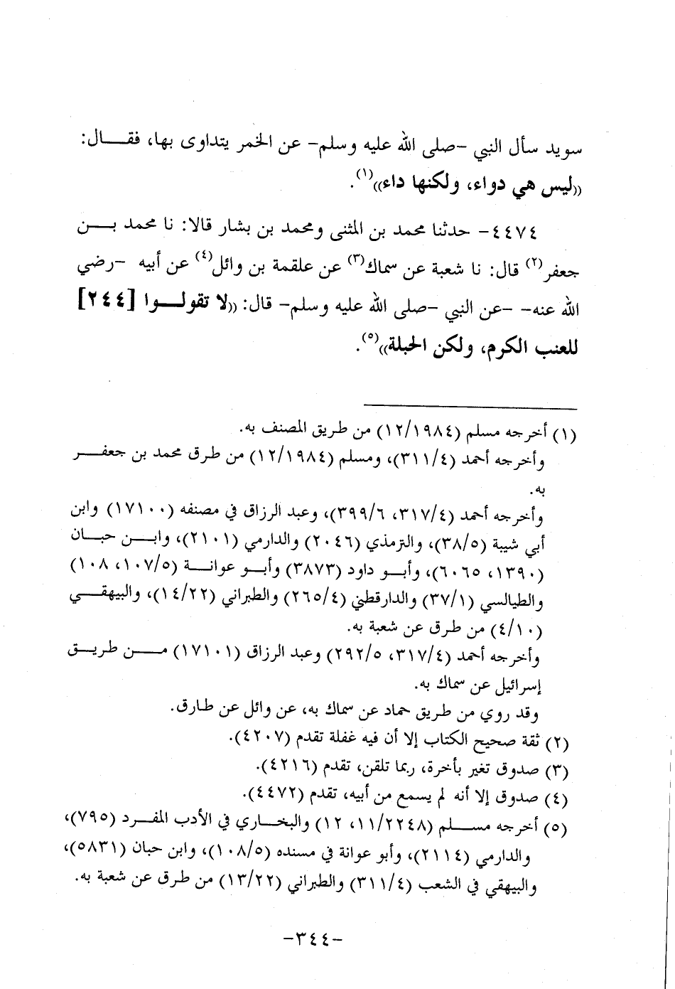 4474- حَدَّثنا مُحَمَّدُ بْنَ الْمُثَنَّى، ومُحَمد بْنُ بَشَّار، قَالاَ: حَدَّثنَا مُحَمَّدُ بْنَ جَعْفَرٍ، قَال: حَدَّثنا شُعْبَةُ، عَن سِمَاك عَنْ عَلْقَمَةَ بْنِ وَائِلٍ، عَن أَبيهِ، رَضِي اللَّهُ عَنْهُ، عَنِ النَّبِيّ صَلَّى اللَّهُ عَلَيه وَسَلَّم، قَال: لاَ تَقُولُوا لِلْعِنَبِ الْكَرْمُ، وَلكن الْحَبَلَةُ.