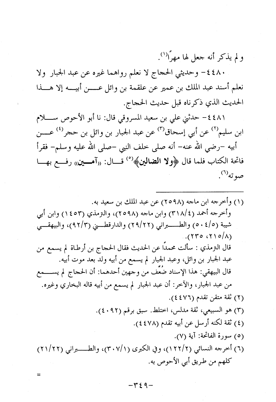 4481- حدثني على بن سَعِيد المسروقي، قَال: حَدَّثنا أَبُو الأَحْوَصِ سَلامُ بْنُ سُلَيْمٍ، عَن أَبِي إِسْحَاقَ، عَن عَبد الْجَبَّارِ بْنِ وَائِلِ بْنِ حُجْر، عَن أَبيهِ، رَضِي اللَّهُ عَنْهُ، أَنَّهُ صَلَّى خَلْفَ النَّبِيّ صَلَّى اللَّهُ عَلَيه وَسَلَّم فَقَرَأَ فَاتِحَةَ الْكِتَابِ فَلَمَّا قَالَ {وَلا الضَّالِّينَ} قَالَ: آمِينَ رَفَعَ بِهَا صَوْتَهُ.