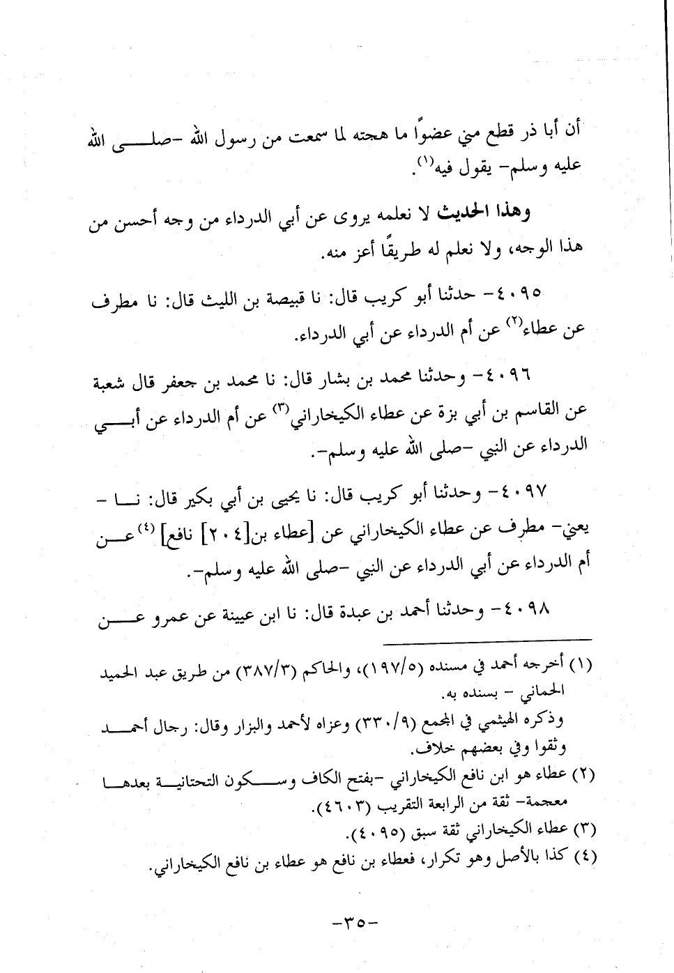 4097- وحَدَّثنا أَبُو كُرَيب، قَال: حَدَّثنا يَحْيَى بن أبي بكير، قَال: حَدَّثنا، يعني مطرف، عَن عَطاء الكيخاراني، عَن عَطاء بن نافع عَنْ أُمِّ الدَّرْدَاءِ عَنْ أَبِي الدَّرْدَاءِ عَنِ النَّبِيّ صَلَّى الله عَلَيه وَسَلَّم (ح)