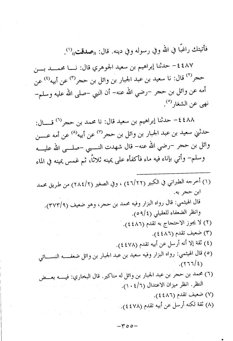 4488- حَدَّثنا إبراهيم بن سَعِيد، قَال: حَدَّثنا مُحَمد بْنُ حُجْر، قَالَ: حَدَّثني سَعِيد بْنُ عَبد الْجَبَّارِ بْنِ وَائِلِ بْنِ حُجْر، عَن أَبيهِ، عَن أُمِّهِ عَنْ وَائِلِ بْنِ حُجْر، رَضِي اللَّهُ عَنْهُ، قَالَ شَهِدْتُ النَّبِيّ صَلَّى اللَّهُ عَلَيه وَسَلَّم وَأُتِيَ بِإِنَاءٍ فِيهِ مَاءٌ فَأَكْفَأَهُ عَلَى يَمِينِهِ ثَلاثًا، ثُمَّ غَمَسَ يَمِينَهُ فِي الْمَاءِ فَغَسَلَ بِهَا يَسَارَهُ ثَلاثًا، ثُمَّ أَدْخَلَ يَمِينَهُ فِي الْمَاءِ فَحَفَنَ بِهَا حَفْنَةً مِنَ الْمَاءِ فَمَضْمَضَ وَاسْتَنْشَقَ ثَلاثًا وَاسْتَنْثَرَ، ثُمَّ أَدْخَلَ كَفَّيْهِ فِي الإِنَاءِ فَرَفَعَهَا إِلَى وَجْهِهِ فَغَسَلَ وَجْهَهُ ثَلاثًا وَغَسَلَ بَاطِنَ أُذُنَيْهِ وَأَدْخَلَ إصبَعَيْهِ فِي دَاخِلِ أُذُنَيْهِ وَمَسَحَ ظَاهِرَ رَقَبَتِهِ وَبَاطِنَ لِحْيَتِهِ ثَلاثًا، ثُمَّ أَدْخَلَ يَمِينَهُ فِي الْمَاءِ فَغَسَلَ بِهَا ذِرَاعَهُ الْيُمْنَى حَتَّى جَاوَزَ الْمِرْفَقَ ثَلاثًا، ثُمَّ غَسَلَ يَسَارَهُ بِيَمِينِهِ حَتَّى جَاوَزَ الْمِرْفَقَ ثَلاثًا، ثُمَّ مَسَحَ عَلَى رَأْسِهِ ثَلاثًا وَظَاهِرَ أُذُنَيْهِ ثَلاثًا وَظَاهِرَ رَقَبَتِهِ وَأَظُنُّهُ قَالَ وَظَاهِرَ لِحْيَتِهِ ثَلاثًا، ثُمَّ غَسَلَ بِيَمِينِهِ قَدَمَهُ الْيُمْنَى ثَلاثًا وَفَصَلَ بَيْنَ أَصَابِعِهِ، أَوْ قَالَ خَلَّلَ بَيْنَ أَصَابِعِهِ وَرَفَعَ الْمَاءَ حَتَّى جَازَ الْكَعْبَ، ثُمَّ رَفَعَهُ فِي السَّاقِ، ثُمَّ فَعَلَ بِالْيُسْرَى مِثْلَ ذَلِكَ، ثُمَّ أَخَذَ حَفْنَةً من ماء فمل بِهَا يَدَهُ، ثُمَّ وَضَعَهَا عَلَى رَأْسِهِ حَتَّى انْحَدَرَ الْمَاءُ مِنْ جَوَانِبِهِ، وَقال هَذَا تَمَامُ الْوُضُوءِ وَلَمْ أَرَهُ تَنَشَّفَ بِثَوْبٍ، ثُمَّ نَهَضَ إِلَى الْمَسْجِدِ فَدَخَلَ فِي الْمِحْرَابِ - يَعْنِي- مَوْضِعَ الْمِحْرَابِ فَصَفَّ النَّاسَ خَلْفَهُ، وعَن يَمِينِهِ، وعَن يَسَارِهِ، ثُمَّ رَفَعَ يَدَيْهِ حَتَّى حَاذَتَا بِشَحْمَةِ أُذُنَيْهِ، ثُمَّ وَضَعَ يَمِينَهُ عَلَى يَسَارِهِ عِنْدَ صَدْرِهِ، ثُمَّ افْتَتَحَ الْقِرَاءَةَ فَجَهَرَ بِالْحَمْدِ، ثُمَّ فَرَغَ مِنْ سُورَةِ الْحَمْدِ، ثُمَّ قَالَ: آمِينَ حَتَّى سَمِعَ مَنْ خَلْفَهُ، ثُمَّ قَرَأَ سُورَةً أُخْرَى، ثُمَّ رَفَعَ يَدَيْهِ بِالتَّكْبِيرِ حَتَّى حَاذَتَا بِشَحْمَةِ أُذُنَيْهِ، ثُمَّ رَكَعَ فَجَعَلَ يَدَيْهِ عَلَى ركبيتيه وَفَرَّجَ بَيْنَ أَصَابِعِهِ وَأَمْهَلَ فِي الرُّكُوعِ حَتَّى اعْتَدَلَ وَصَارَ صُلْبُهُ لَوْ وُضِعَ عَلَيْهِ قَدَحٌ مِنَ الْمَاءِ مَا انْكَفَأَ، ثُمَّ رَفَعَ رَأْسَهُ صَلَّى اللَّهُ عَلَيه وَسَلَّم بِخُشُوعٍ، وَقال: سَمِعَ اللَّهُ لِمَنْ حَمِدَهُ، ثُمَّ رَفَعَ يَدَيْهِ حَتَّى حَاذَتَا بِشَحْمَةِ أُذُنَيْهِ، ثُمَّ انْحَطَّ لِلسُّجُودِ بِالتَّكْبِيرِ فَرَفَعَ يَدَيْهِ إِلَى أَنْ حَاذَتَا بِشَحْمَةِ أُذُنَيْهِ، ثُمَّ أَثْبَتَ جَبْهَتَهُ فِي الأَرْضِ حَتَّى إِنِّي أَرَى أَنْفَهُ فِي الرَّمْلِ وَقَوَّسَ بِذِرَاعَيْهِ وَرَأْسِهِ وَبَسَطَ فَخِذَهُ الْيَسَارَ وَنَصَبَ الْيَمِينَ كَمَا أَثْبَتَ أَصَابِعَ رِجْلَيْهِ وَلَمْ يُمْهِلْ بِالسُّجُودِ وَرَفَعَ رَأْسَهُ فَرَفَعَ يَدَيْهِ بِالتَّكْبِيرِ إِلَى أَنْ حَاذَتَا بِشَحْمَةِ أُذُنَيْهِ وَجَلَسَ جِلْسَةً خَفِيفَةً فَوَضَعَ كَفَّهُ الْيَمِينَ عَلَى رُكْبَتِهِ وَبَعْضِ فَخِذِهِ وَحَلَّقَ بِأُصْبُعِهِ، ثُمَّ انْحَطَّ سَاجِدًا بِمِثْلِ ذَلِكَ، ثُمَّ رَفَعَ رَأْسَهُ بِالتَّكْبِيرِ بِيَدَيْهِ إِلَى أَنْ حَاذَتَا بِشَحْمَةِ أُذُنَيْهِ وَإِلَى أَنِ اعْتَدَلَ فِي قِيَامِهِ وَرَجَعَ كُلُّ عَظْمٍ إِلَى مَوْضِعِهِ، ثُمَّ صَلَّى أَرْبَعَ رَكَعَاتٍ يَفْعَلُ فِيهِنَّ مَا يَفْعَلُ فِي هَذِهِ، ثُمَّ جَلَسَ جِلْسَةً فِ