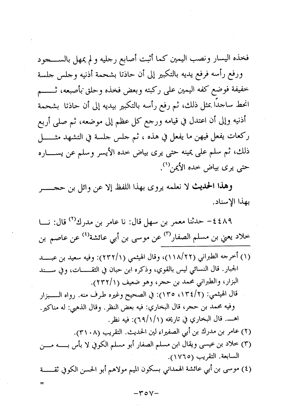 4489- حَدَّثنا مَعْمَر بن سَهْل، قَال: حَدَّثنا عامر بن مدرك، قَال: حَدَّثنا خَلادٌ، يَعْنِي ابْنَ مُسْلِمٍ الصَّفَّارَ عَنْ مُوسَى بْنِ أَبِي عَائِشَةَ عَنْ عَاصِم بْنِ كُلَيْبٍ، عَن أَبيهِ، عَن وَائِلِ بْنِ حُجْر، رَضِي اللَّهُ عَنْهُ، قَالَ: تَفَقَّدْتُ صَلاةَ النَّبِيّ صَلَّى اللَّهُ عَلَيه وَسَلَّم فَرَأَيْتُهُ يَرْفَعُ يَدَيْهِ إِذَا كَبَّرَ، ثُمَّ يَضَعُ يَدَيْهِ وَاحِدَةً عَلَى الأُخرَى، ثُمَّ إِذَا أَرَادَ أَنْ يَرْكَعَ رَفَعَ يَدَيْهِ فَكَبَّرَ، ثُمَّ قَالَ سَمِعَ اللَّهُ لِمَنْ حَمِدَهُ فَرَفَعَ فَأَوْهَمْتُ رَفَعَ حِينَ سَجَدَ أَمْ لا قَالَ فَرَكَعَ رَكْعَتَيْنِ فَلَمَّا قَعَدَ لِلتَّشَهُّدِ افْتَرَشَ رِجْلَهُ الْيُسْرَى وَوَضَعَ يَدَهُ الْيُمْنَى عَلَى فَخِذِهِ، ثُمَّ عقد إصبَعَيْهِ، ثُمَّ حَلَّقَ حَلْقَةً وَأَشَارَ بِالسَّبَّابَةِ وَسَلَّمَ عَنْ يَمِينِهِ، وعَن يَسَارِهِ قَالَ وَرَأَيْتُهُ يُكَبِّرُ كُلَّمَا خفض ورفع.