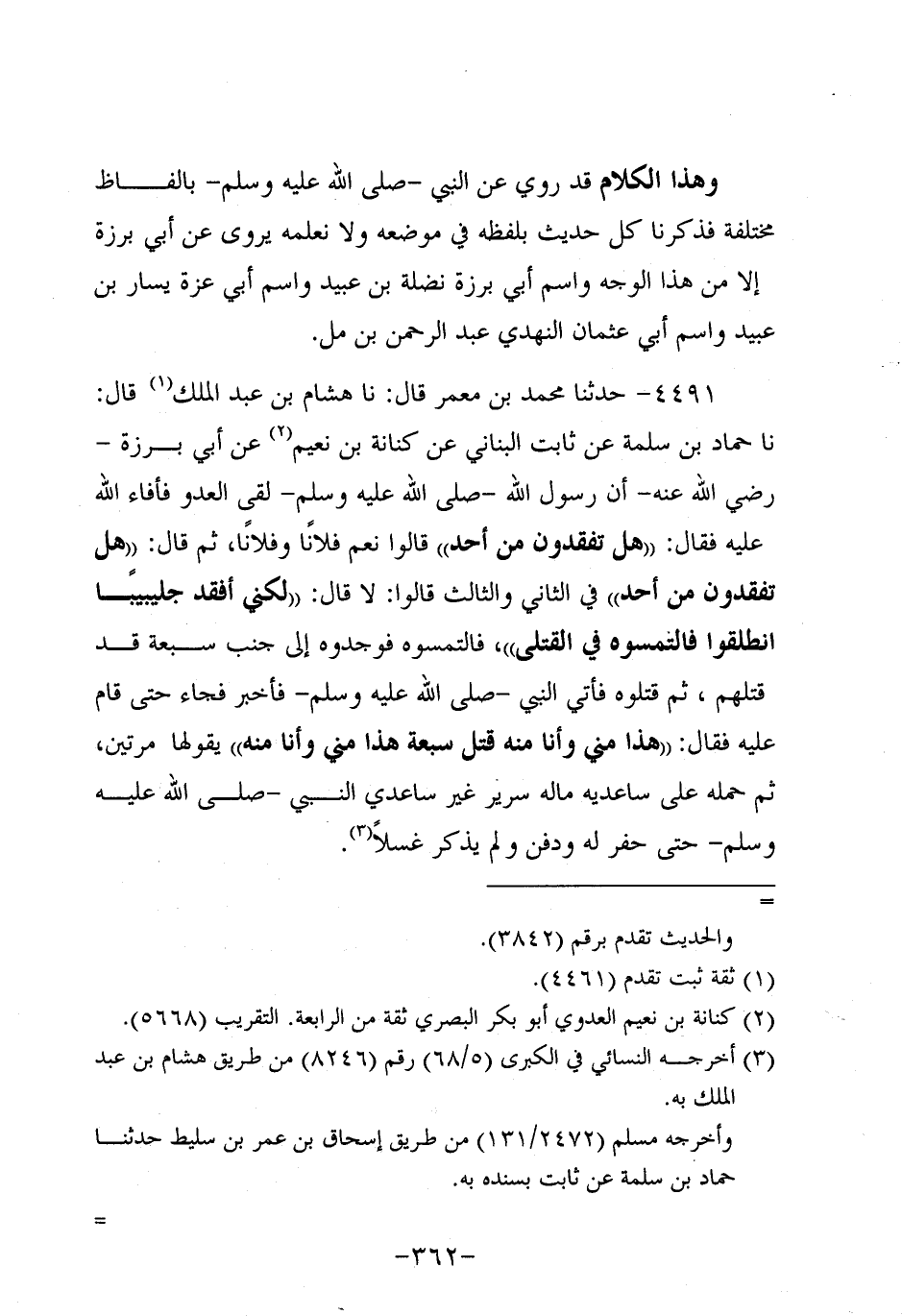 4491- حَدَّثنا مُحَمد بن مَعْمَر، قَال: حَدَّثنا هشام بن عَبد الملك، قَال: حَدَّثنا حَمَّادُ بْنُ سَلَمَةَ عَنْ ثَابِتٍ الْبُنَانِيِّ عَنْ كِنَانَةَ بْنِ نُعَيْمٍ، عَن أَبِي بَرْزَةَ، رَضِي اللَّهُ عَنْهُ، أَنَّ رَسُولَ اللهِ صَلَّى اللَّهُ عَلَيه وَسَلَّم لَقِيَ الْعَدُوَّ فَأَفَاءَ اللَّهُ عَلَيْهِ فَقَالَ: هَلْ تَفْقِدُونَ مِنْ أَحَدٍ قَالُوا نَعَمْ فُلانًا وَفُلانًا، ثُمَّ قَالَ: هَلْ تَفْقِدُونَ مِنْ أحد في الثاني والثالت قَالُوا: لا قَالَ: لَكِنِّي أَفْقِدُ جُلَيْبِيبًا انْطَلِقُوا فَالْتَمِسُوهُ فِي الْقَتْلَى فَالْتَمَسُوهُ فَوَجَدُوهُ إِلى جَنْبِ سَبْعَةٍ قَدْ قَتَلَهُمْ، ثُمَّ قَتَلُوهُ فَأُتِيَ النَّبِيّ صَلَّى اللَّهُ عَلَيه وَسَلَّم فَأُخْبِرَ فَجَاءَ حَتَّى قَامَ عَلَيْهِ فَقَالَ: هَذَا مِنِّي، وَأنا مِنْهُ قَتَلَ سَبْعَةً هَذَا مِنِّي، وَأنا مِنْهُ يَقُولُهَا مَرَّتَيْنِ، ثُمَّ حمله على ساعديه ماله سَرِيرٌ غَيْرَ سَاعِدَيِ النَّبِيّ صَلَّى اللَّهُ عَلَيه وَسَلَّم حَتَّى حُفِرَ لَهُ وَدُفِنَ وَلَمْ يَذْكُرْ غُسْلا.