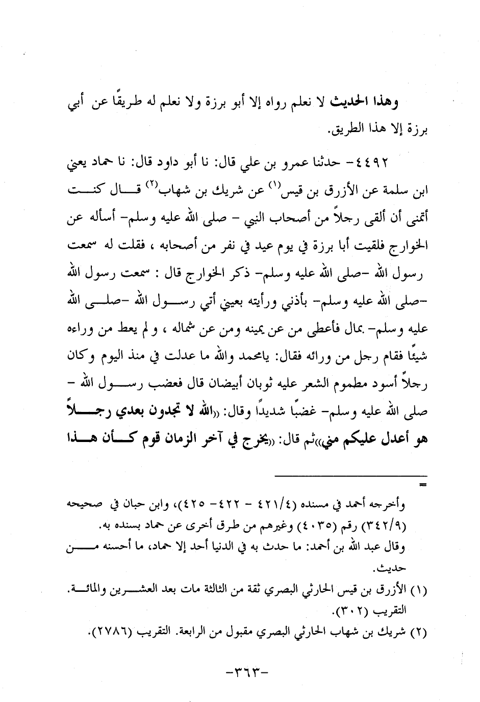 4492- حَدَّثنا عَمْرو بن علي، قَال: حَدَّثنا أَبُو داود، قَال: حَدَّثنا حَمَّادٌ، يَعْنِي ابْنَ سَلَمَةَ عَنِ الأَزْرَقِ بْنِ قَيْسٍ، عَن شَرِيكِ بْنِ شِهاب قَالَ كُنْتُ أَتَمَنَّى أَنْ أَلْقَى رَجُلا مِنْ أَصْحَابِ النَّبِيّ صَلَّى اللَّهُ عَلَيه وَسَلَّم أَسْأَلُهُ عَنِ الْخَوَارِجِ فَلَقِيتُ أَبَا بَرْزَةَ فِي يَوْمِ عِيدٍ فِي نَفَرٍ مِنْ أَصْحَابِهِ فَقُلْتُ لَهُ سَمِعْتَ رَسُولَ اللَّهِ صَلَّى اللَّهُ عَلَيه وَسَلَّم ذَكَرَ الْخَوَارِجَ قَالَ: سَمِعْتُ رَسُولَ اللَّهِ صَلَّى اللَّهُ عَلَيه وَسَلَّم بِأُذُنِي وَرَأَيْتُهُ بِعَيْنِي أُتِيَ رَسُولُ اللَّهِ صلى اله عَلَيْهِ وَسَلَّمَ بِمَالٍ فَأَعْطَى مَنْ عَنْ يَمِينِهِ وَمَنْ عَنْ شِمَالِهِ وَلَمْ يُعْطِ مَنْ وَرَاءَهُ شَيْئًا فَقَامَ رَجُلٌ مِنْ وَرَائِهِ فَقَالَ: يَا مُحَمَّدُ وَاللَّهِ مَا عَدَلْتَ فِيَّ مُنْذُ الْيَوْمِ، وَكان رَجُلا أَسْوَدَ مَطْمُومَ الشَّعَرِ عَلَيْهِ ثَوْبَانِ أَبْيَضَانِ قَالَ فَغَضِبَ رَسُولُ اللَّهِ صَلَّى اللَّهُ عَلَيه وَسَلَّم غَضَبًا شَدِيدًا، وَقال: اللَّهِ لا تَجِدُونَ بَعْدِي رَجُلا هُوَ أَعْدَلُ عَلَيْكُمْ مِنِّي، ثُمَّ قَالَ: يَخْرُجُ فِي آخِرِ الزَّمَانِ قَوْمٌ كأن هذا منهم يقرؤُون الْقُرْآنَ لا يُجَاوِزُ تَرَاقِيَهُمْ يَمْرُقُونَ مِنَ الإِسْلامِ كَمَا يَمْرُقُ السَّهْمُ مِنَ الرَّمِيَّةِ سِيمَاهُمُ التَّحْلِيقُ لا يَزَالُونَ يَخْرُجُونَ حَتَّى يَخْرُجَ آخِرُهُمْ مَعَ المسيح الدجال فإذا لقيتموهم فقاتلوهم شَرُّ الْخَلْقِ وَالْخَلِيقَةِ.
