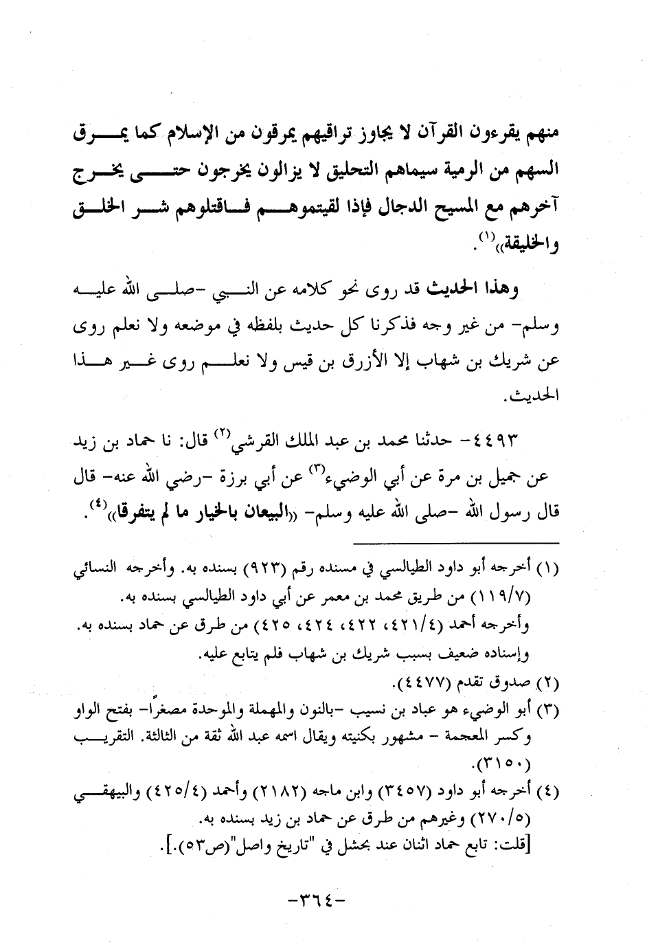 4493- حَدَّثنا مُحَمد بْنُ عَبد الْمَلِكِ الْقُرَشِيُّ، قَال: حَدَّثنا حَمَّادُ بْنُ زَيْدٍ، عَن جَمِيلِ بْنِ مُرَّةَ، عَن أَبِي الْوَضِيءِ، عَن أَبِي بَرْزَةَ، رَضِي اللَّهُ عَنْهُ، قَالَ: قَالَ رَسُول اللهِ صَلَّى اللَّهُ عَلَيه وَسَلَّم: الْبَيِّعَانِ بِالْخِيَارِ مَا لَمْ يَتَفَرَّقَا.