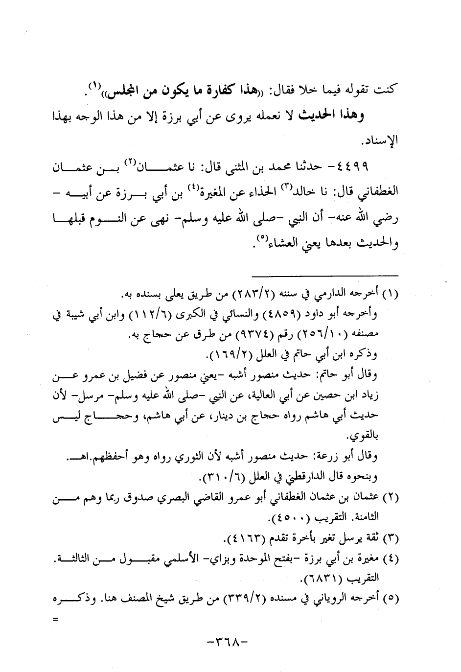 4499- حَدَّثنا مُحَمد بن المثنى، قَال: حَدَّثنا عُثمَان بن عُثمَان الغطفاني، قَال: حَدَّثنا خَالِدٌ الحَذَّاء عَنِ الْمُغِيرَةِ بْنِ أَبِي بَرْزَةَ، عَن أَبيهِ، رَضِي اللَّهُ عَنْهُ، أَنَّ النَّبيَّ صَلَّى اللَّهُ عَلَيه وَسَلَّم نَهَى عَنِ النَّوْمِ قَبْلَهَا وَالْحَدِيثِ بَعْدَهَا، يَعْنِي الْعِشَاءَ.
