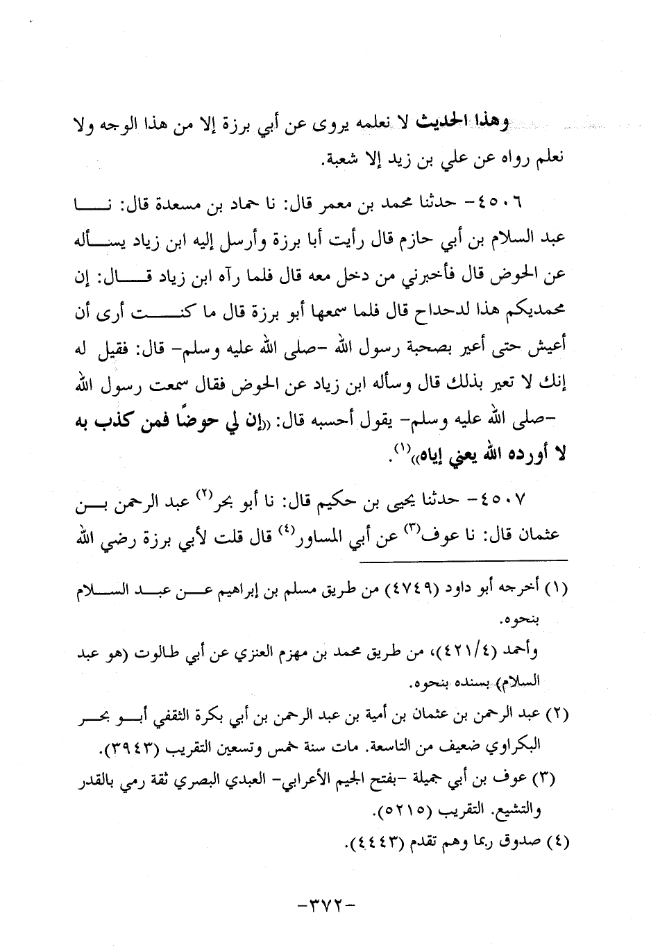 4506- حَدَّثنا مُحَمد بن مَعْمَر، قَال: حَدَّثنا حماد بن مسعدة، قَال: حَدَّثنا عَبد السَّلامِ بْنُ أَبِي حَازِمٍ قَالَ رَأَيْتُ أبا برزة وأرسل إليه بن زِيَادٍ يَسْأَلُهُ عَنِ الْحَوْضِ قَالَ فَأَخْبَرَنِي مَنْ دَخَلَ مَعَهُ قَالَ فَلَمَّا رَآهُ ابْنُ زِيَادٍ قَالَ: إِنَّ مُحَمَّدِيَّكُمْ هَذَا لَدَحْدَاحٌ قَالَ فَلَمَّا سَمِعَهَا أَبُو بَرْزَةَ قَالَ مَا كُنْتُ أَرَى أَنْ أَعِيشَ حَتَّى أُعَيَّرَ بِصُحْبَةِ رَسُولِ اللَّهِ صَلَّى اللَّهُ عَلَيه وَسَلَّم قَالَ فَقِيلَ لَهُ إِنَّكَ لا تُعَيَّرُ بِذَلِكَ قَالَ وَسَأَلَهُ ابْنُ زِيَادٍ عَنِ الْحَوْضِ فَقَالَ سَمِعْتُ رَسُولَ اللَّهِ صَلَّى اللَّهُ عَلَيه وَسَلَّم يَقُولُ أَحْسَبُهُ قَالَ: إِنَّ لِي حَوْضًا فَمَنْ كَذَّبَ بِهِ لا أَوْرَدَهُ اللَّهُ يَعْنِي إِيَّاهُ.