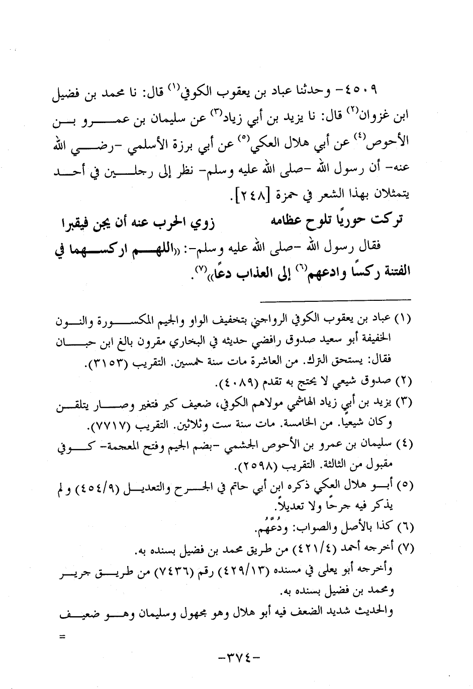 4509- وحَدَّثنا عباد بن يعقوب الكوفي، قَال: حَدَّثنا مُحَمد بن فضيل بن غزوان، قَال: حَدَّثنا يَزِيدُ بنُ أَبِي زِيَادٍ، عَن سُلَيمان بْنِ عَمْرو بْنِ الأَحْوَصِ، عَن أَبِي هِلالٍ الْعَكِّيِّ، عَن أَبِي بَرْزَةَ الأَسْلَمِيِّ، رَضِي اللَّهُ عَنْهُ، أَنَّ رَسُولَ اللهِ صَلَّى اللَّهُ عَلَيه وَسَلَّم نَظَرَ إِلَى رَجُلَيْنِ فِي أُحُدٍ يَتَمَثَّلانِ بِهَذَا الشعر في حمزة.