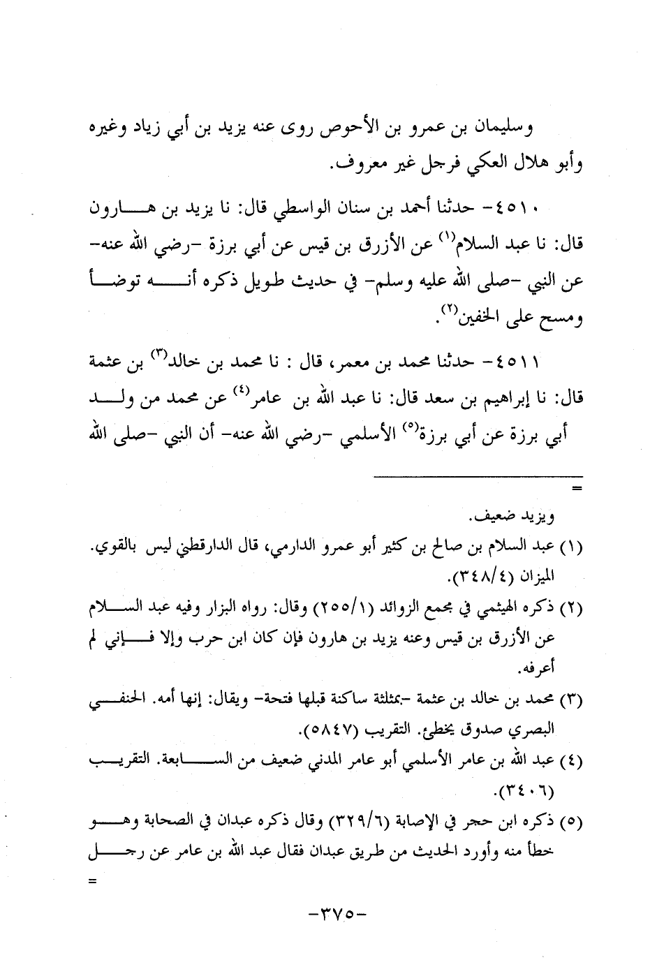 4510- حَدَّثنا أحمد بن سنان الواسطي، قَال: حَدَّثنا يزيد بن هارون، قَال: حَدَّثنا عَبد السَّلامِ عَنِ الأَزْرَقِ بْنِ قَيْسٍ، عَن أَبِي بَرْزَةَ، رَضِي اللَّهُ عَنْهُ، عَنِ النَّبِيّ صَلَّى اللَّهُ عَلَيه وَسَلَّم فِي حَدِيثٍ طَوِيلٍ ذَكَرَهُ أَنَّهُ تَوَضَّأَ وَمَسَحَ عَلَى الْخُفَّيْنِ.