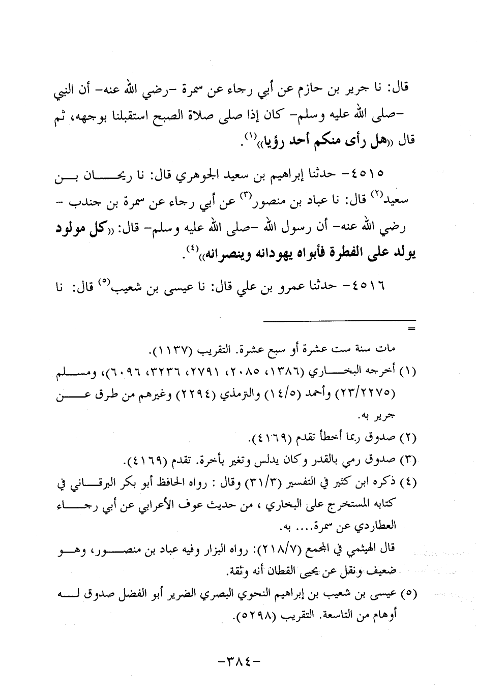 4515- حَدَّثنا إبراهيم بن سَعِيد الجوهري، قَال: حَدَّثنا ريحان بن سَعِيد، قَال: حَدَّثنا عَبَّادُ بْنُ مَنْصُورٍ، عَن أَبِي رَجَاءٍ عَنْ سَمُرة بْنِ جُنْدُبٍ، رَضِي اللَّهُ عَنْهُ، أَنَّ رَسُولَ اللهِ صَلَّى اللَّهُ عَلَيه وَسَلَّم قَالَ: كُلُّ مَوْلُودٍ يُولَدُ عَلَى الْفِطْرَةِ فَأَبَوَاهُ يُهَوِّدَانِهِ وينصرانه.