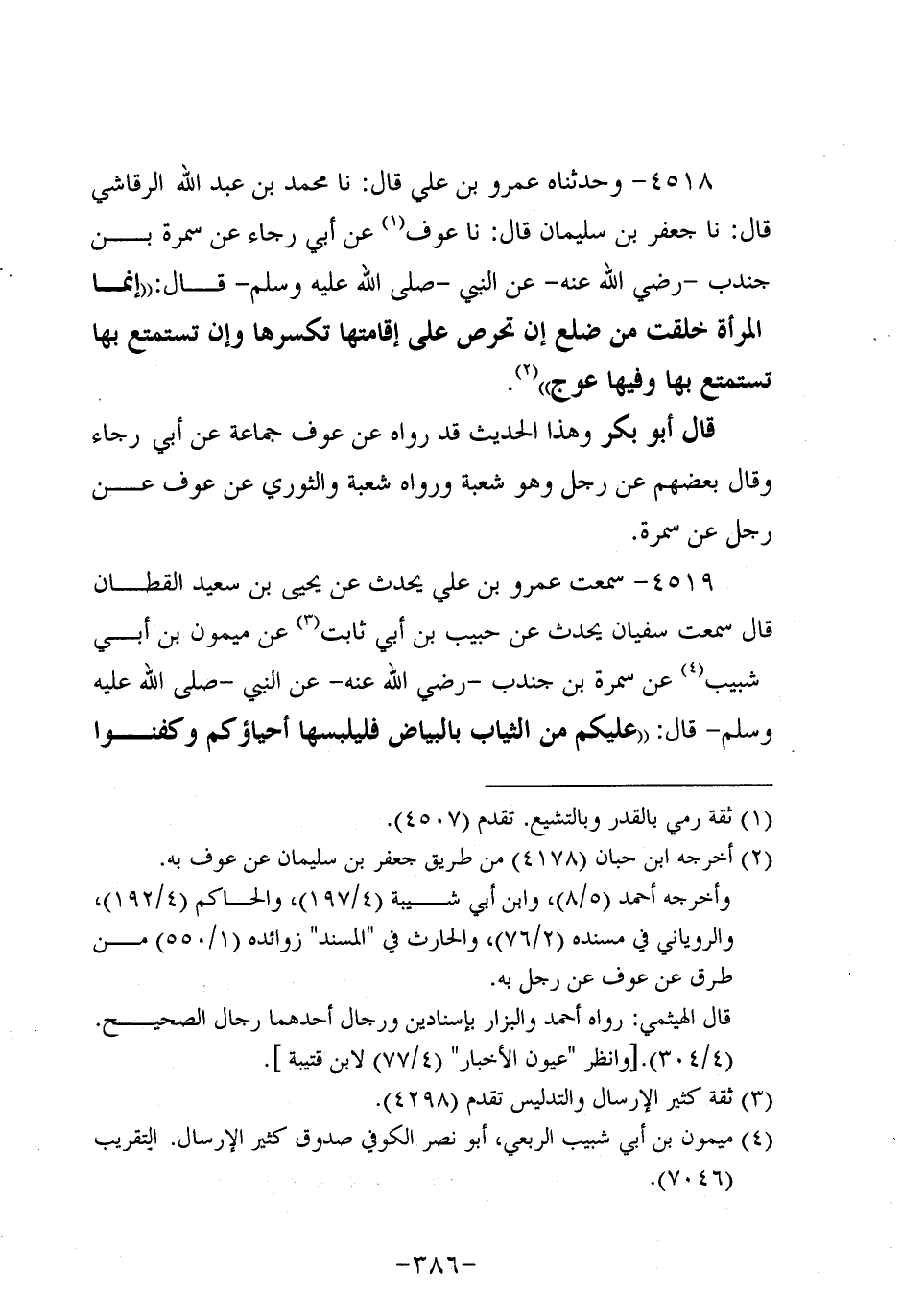 4518- وحَدَّثنا عَمْرو بن علي، قَال: حَدَّثنا مُحَمد بن عَبد الله الرقاشي، قَال: حَدَّثنا جعفر بن سليمان، قَال: حَدَّثنا عَوْفٌ، عَن أَبِي رَجَاءٍ عَنْ سَمُرة بْنِ جُنْدُبٍ، رَضِي اللَّهُ عَنْهُ، عَنِ النَّبِيّ صَلَّى اللَّهُ عَلَيه وَسَلَّم قَالَ: إِنَّمَا الْمَرْأَةُ خُلِقَتْ مِنْ ضِلْعٍ إِنْ تَحْرِصْ عَلَى إِقَامَتِهَا تَكْسِرْهَا، وَإن تَسْتَمْتِعْ بِهَا تَسْتَمْتِعْ بِهَا وَفِيهَا عِوَجٌ.