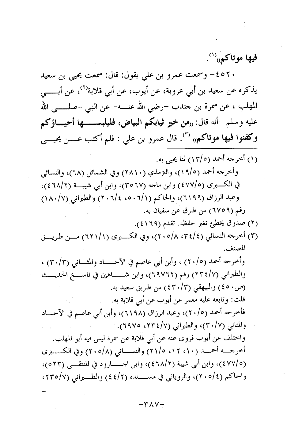 4520- وَسَمِعْتُ عَمْرو بْنَ عَلِيٍّ يَقُولُ:، قَالَ: سَمِعْتُ يَحْيَى بْنَ سَعِيد يَذْكُرُهُ، عَن سَعِيد بْنِ أَبِي عَرُوبة عَنْ أَيُّوبَ، عَن أَبِي قِلاَبَةَ، عَن أَبِي الْمُهَلَّبِ عَنْ سَمُرة بْنِ جُنْدُبٍ، رَضِي اللَّهُ عَنْهُ، عَنِ النَّبِيّ صَلَّى اللَّهُ عَلَيه وَسَلَّم؛ أَنَّه قَالَ: مِنْ خَيْرِ ثِيَابِكُمُ الْبَيَاضُ فَلْيَلْبَسْهَا أَحْيَاؤُكُمْ وَكَفِّنُوا فِيهَا مَوْتَاكُمْ. قَالَ عَمْرو بْنُ عَلِيٍّ: فَلَمْ أَكْتُبْ، عَن يَحيى حَدِيثَ سَعِيد وَحَفِظْتُهُ عَنْهُ.