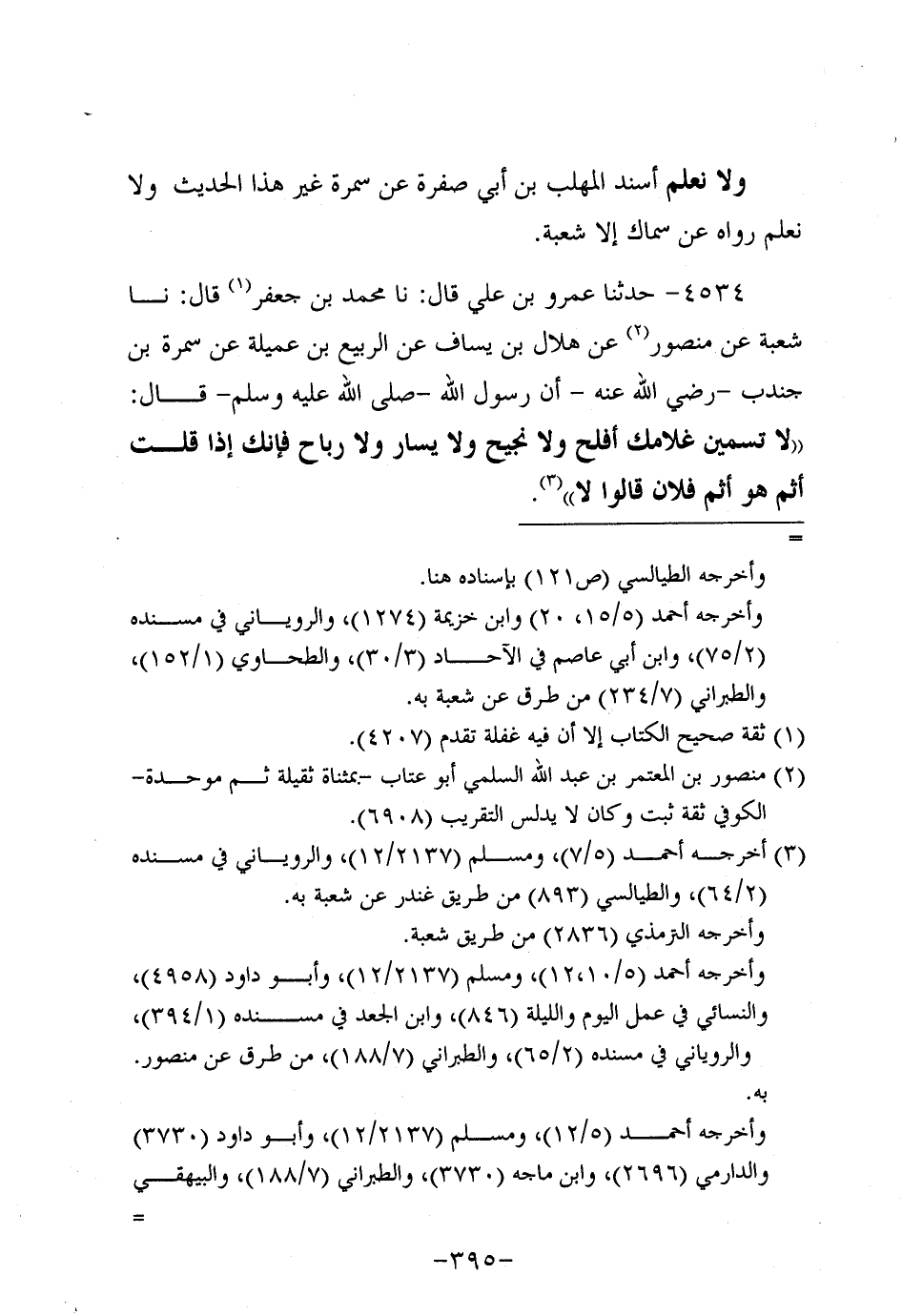 4534- حَدَّثنا عَمْرو بن علي، قَال: حَدَّثنا مُحَمَّدُ بْنَ جَعْفَرٍ، قَال: حَدَّثنا شُعْبَةُ، عَن مَنْصُورٍ عَنْ هِلالِ بْنِ يِسَافٍ عَنِ الرَّبِيعِ بْنِ عُمَيْلَةَ عَنْ سَمُرة بْنِ جُنْدُبٍ، رَضِي اللَّهُ عَنْهُ، أَنَّ رَسُولَ اللهِ صَلَّى اللَّهُ عَلَيه وَسَلَّم، قَال: لاَ تُسَمِّيَنَّ غلامك أفلح، ولاَ نجيح، ولاَ يسار، ولاَ رباح فَإِنَّكَ إِذَا قُلْتَ أَثِمَ هُوَ أَثِمَ فُلانٌ قَالُوا لا.