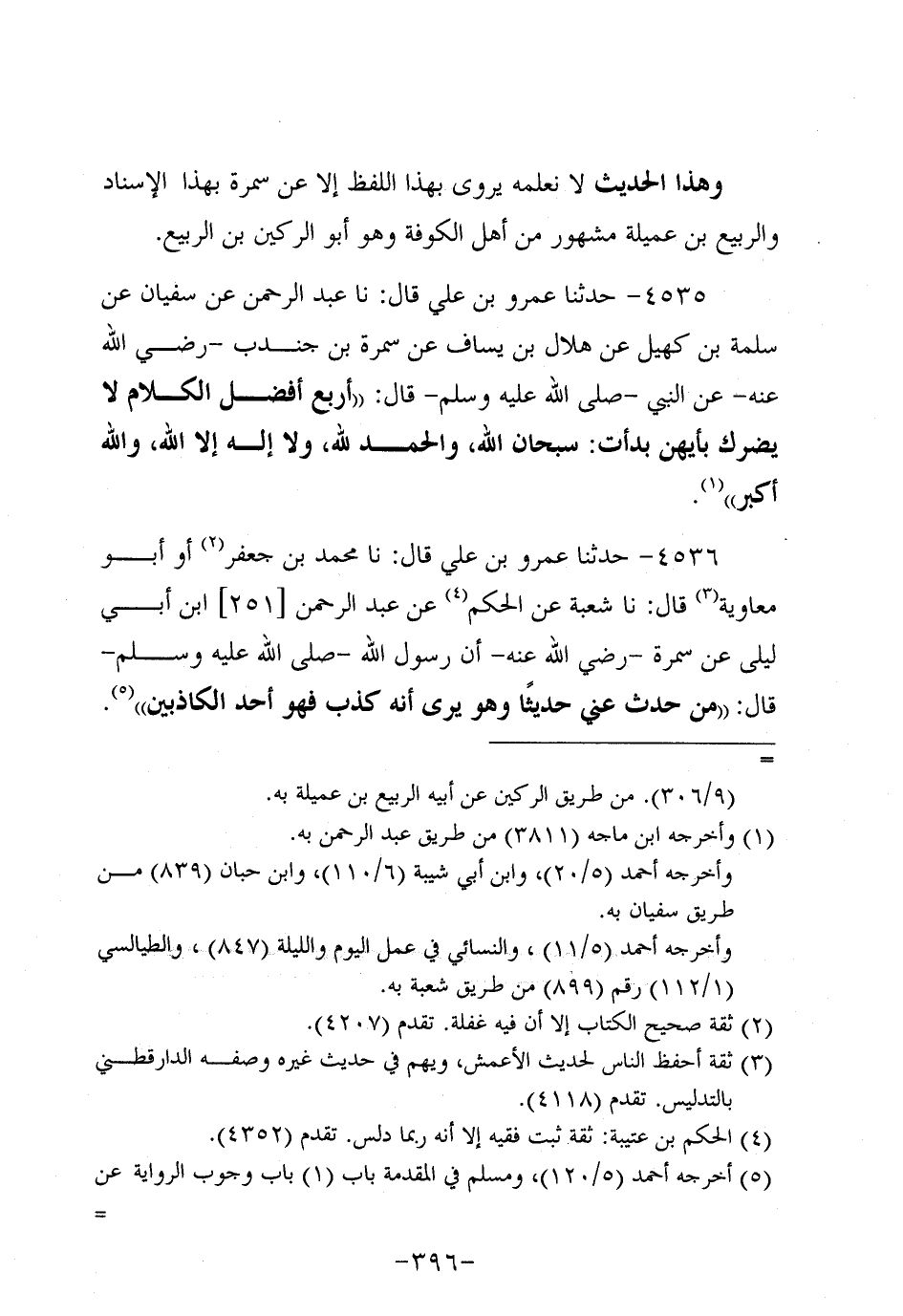 4535- حَدَّثنا عَمْرو بن علي، قَال: حَدَّثنا عَبد الرَّحمَن، عَن سُفيان، عَن سَلَمة بْنِ كُهَيل عَنْ هِلالِ بْنِ يِسَافٍ عَنْ سَمُرة بْنِ جُنْدُبٍ، رَضِي اللَّهُ عَنْهُ، عَنِ النَّبِيّ صَلَّى اللَّهُ عَلَيه وَسَلَّم قَالَ: أَرْبَعٌ أَفْضَلُ الْكَلامِ لا يَضُرُّكَ بِأَيِّهِنَّ بَدَأْتَ: سُبْحَانَ اللَّهِ وَالْحَمْدُ لِلَّهِ، ولاَ إِلَهَ إلاَّ اللَّهُ وَاللَّهُ أكبر.