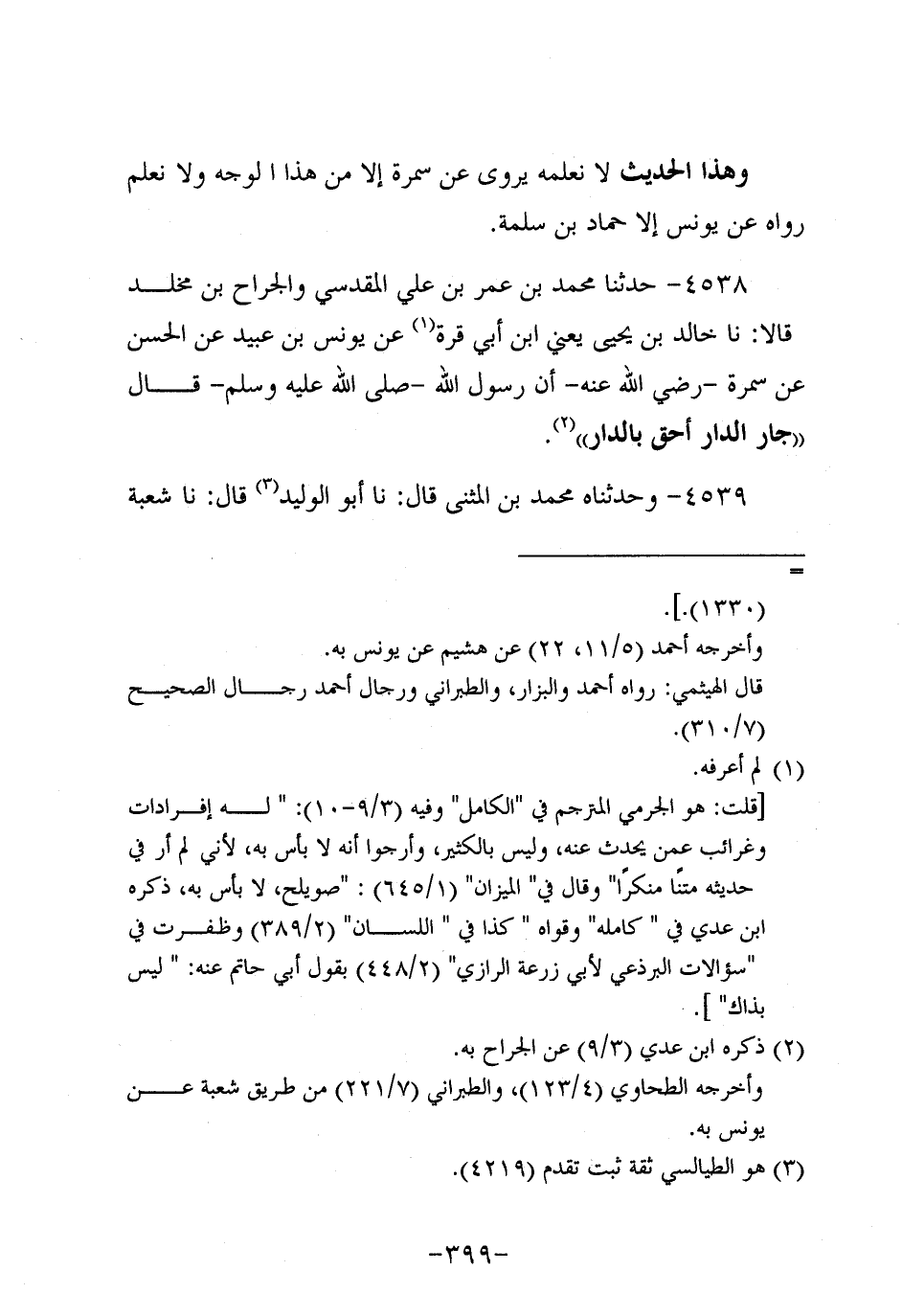 4539- وحَدَّثناه مُحَمد بْنُ الْمُثَنَّى، قَال: حَدَّثنا أَبُو الوليد قال: حَدَّثنا شُعْبَةُ، عَنْ قَتَادَةَ، عَن الْحَسَنِ عَنْ سَمُرة، رَضِي اللَّهُ عَنْهُ، عَنِ النَّبِيّ صَلَّى اللَّهُ عَلَيه وَسَلَّم قَالَ: جَارُ الدَّارِ أَحَقُّ بِالدَّارِ، أَوْ بِالأَرْضِ.