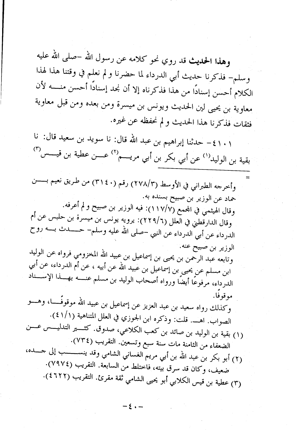 4101- حَدَّثنا إبراهيم بن عَبد الله، قَال: حَدَّثنا سويد بن سَعِيد، قَال: حَدَّثنا بَقِيَّةُ بْنُ الْوَلِيدِ، عَن أَبِي بَكْر بْنِ أَبِي مَرْيَمَ عَنْ عَطِيَّةَ بْنِ قَيْسٍ، عَن أَبِي الدَّرْدَاءِ، رَضِي اللَّهُ عَنْهُ، قَالَ رَسُول اللهِ صَلَّى اللَّهُ عَلَيه وَسَلَّم اخْبُرْ تَقْلُهْ.