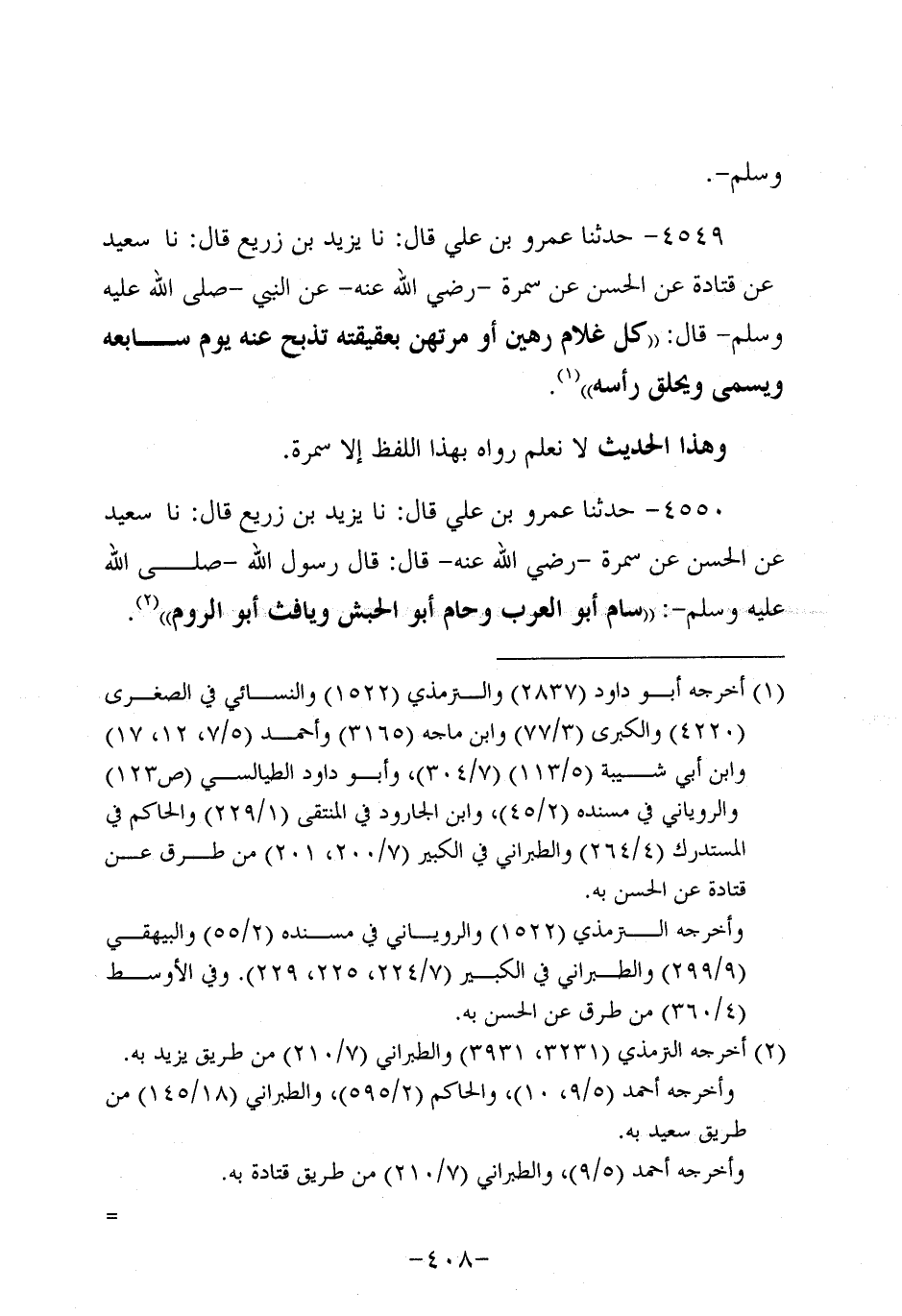 4549- حَدَّثنا عَمْرو بن علي، قَال: حَدَّثنا يزيد بن زريع، قَال: حَدَّثنا سَعِيد، عَنْ قَتَادَةَ، عَن الْحَسَنِ عَنْ سَمُرة، رَضِي اللَّهُ عَنْهُ، عَنِ النَّبِيّ صَلَّى اللَّهُ عَلَيه وَسَلَّم قَالَ: كُلُّ غُلامٍ رَهِينٌ، أَوْ مُرْتَهَنٌ بِعَقِيقَتِهِ تُذْبَحُ عَنْهُ يَوْمَ سَابِعِهِ وَيُسَمَّى وَيُحْلَقُ رَأْسُهُ.