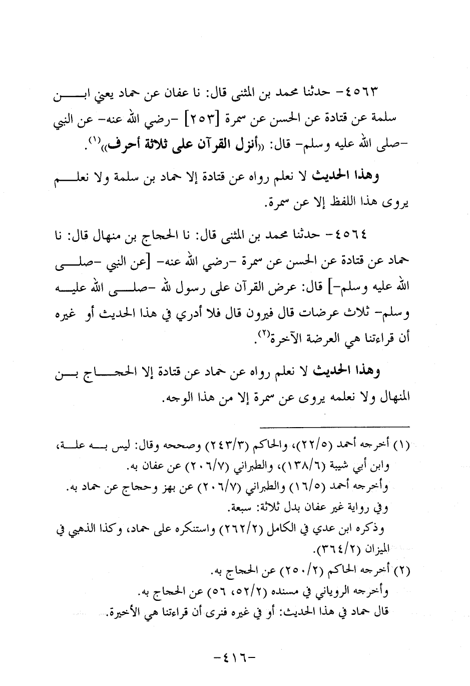 4563- حَدَّثنا مُحَمَّدُ بْنَ الْمُثَنَّى، قَال: حَدَّثنا عَفَّانُ عَنْ حَمَّادٍ، يَعْنِي ابْنَ سَلَمَةَ، عَنْ قَتَادَةَ، عَن الْحَسَنِ عَنْ سَمُرة، رَضِي اللَّهُ عَنْهُ، عَنِ النَّبِيّ صَلَّى اللَّهُ عَلَيه وَسَلَّم قَالَ: أُنْزِلَ الْقُرْآنُ عَلَى ثَلاثَةِ أَحْرُفٍ.