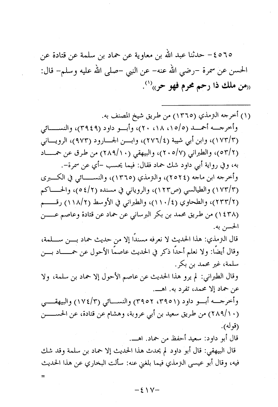 4565- حَدَّثنا عَبد اللَّهِ بْنُ مُعَاوِيَةَ عَنْ حَمَّادِ بْنُ سَلَمَةَ، عَنْ قَتَادَةَ، عَن الْحَسَنِ عَنْ سَمُرة، رَضِي اللَّهُ عَنْهُ، عَنِ النَّبِيّ صَلَّى اللَّهُ عَلَيه وَسَلَّم قَالَ: مَنْ مَلِكَ ذَا رَحِمٍ مَحْرَمٍ فَهُوَ حُرٌّ.