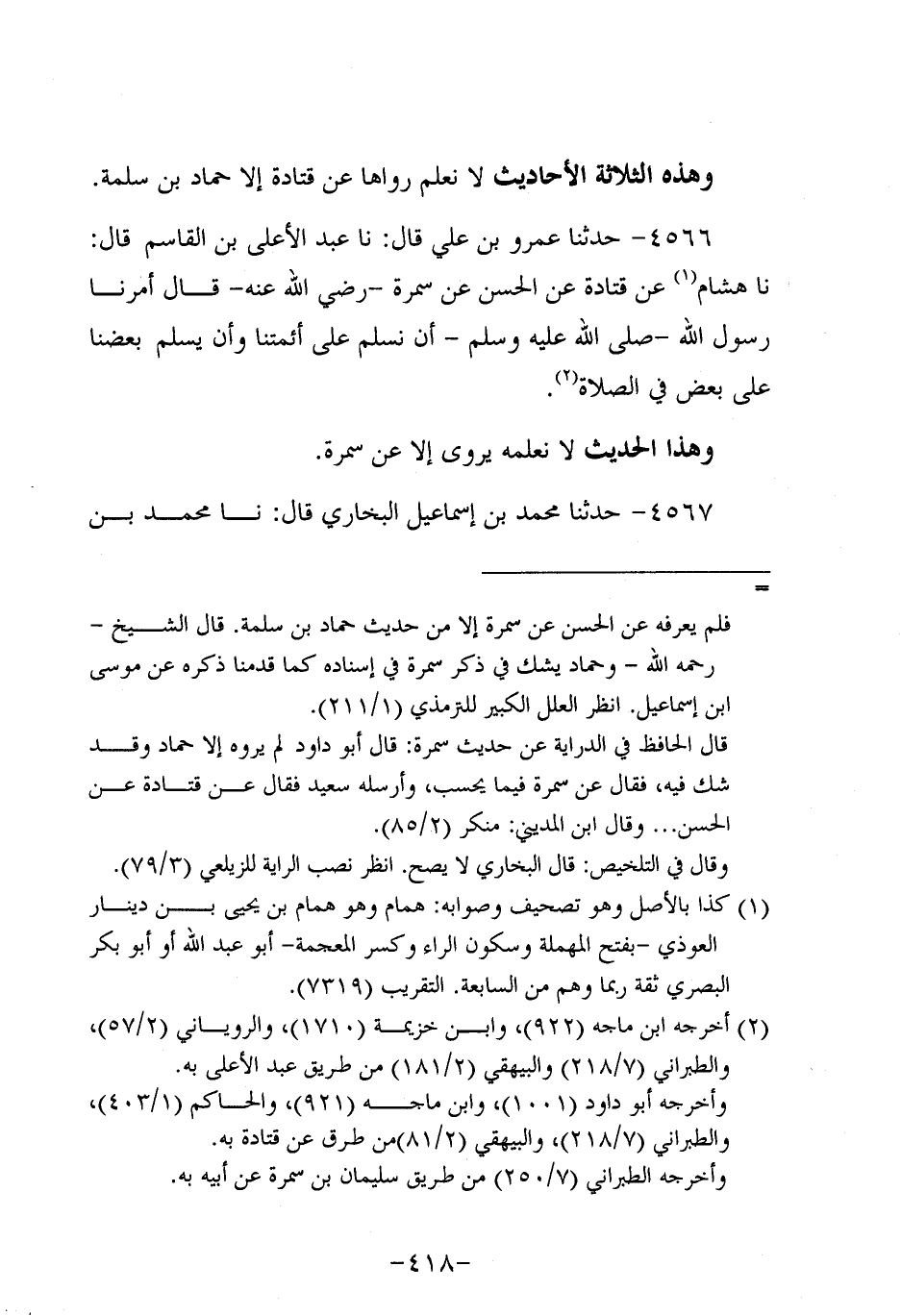 4566- حَدَّثنا عَمْرو بن علي، قَال: حَدَّثنا عَبد الأعلى بن القاسم، قَال: حَدَّثنا هشام، عَنْ قَتَادَةَ، عَن الْحَسَنِ عَنْ سَمُرة، رَضِي اللَّهُ عَنْهُ، قَالَ أَمَرَنَا رَسُولُ اللَّهِ صَلَّى اللَّهُ عَلَيه وَسَلَّم أَنْ نُسَلِّمَ عَلَى أَئِمَّتِنَا وَأَنْ يُسَلِّمَ بَعْضُنَا عَلَى بَعْضٍ فِي الصَّلاةِ.