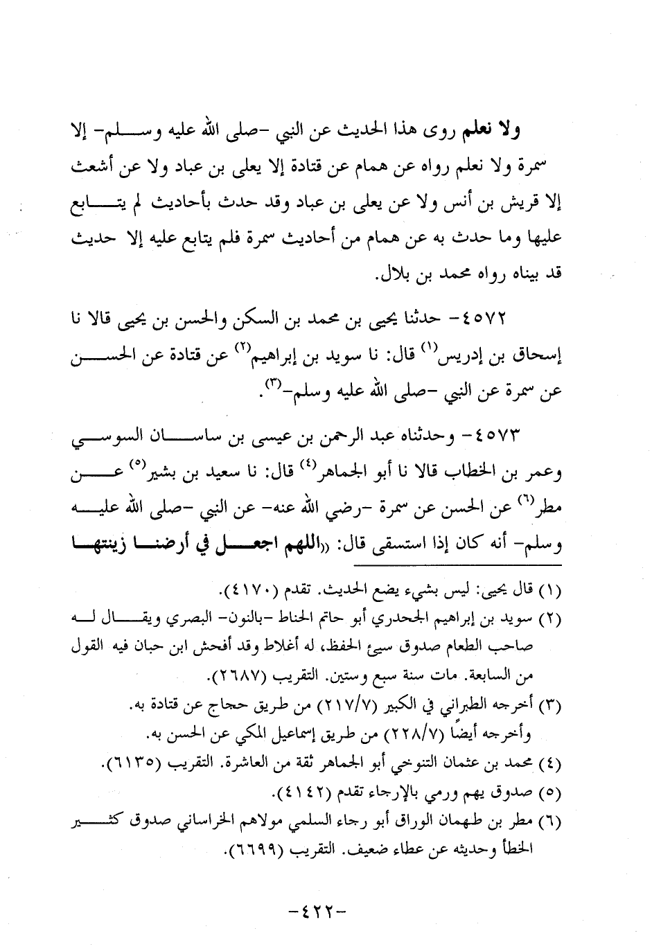 4573- وحَدَّثناه عَبد الرحمن بن عيسى بن ساسانا لسوسي وعمر بن الخطاب، قَالاَ: حَدَّثنَا أَبُو الجماهر، قَال: حَدَّثنا سَعِيد بْنُ بَشِيرٍ عَنْ مَطَرٍ عَنِ الْحَسَنِ عَنْ سَمُرة، رَضِي اللَّهُ عَنْهُ، عَنِ النَّبِيّ صَلَّى اللَّهُ عَلَيه وَسَلَّم؛ أَنَّه كَانَ إِذَا اسْتَسْقَى قَالَ: اللَّهُمَّ اجْعَلْ فِي أَرْضِنَا زِينَتَهَا وَسَكَنَهَا.