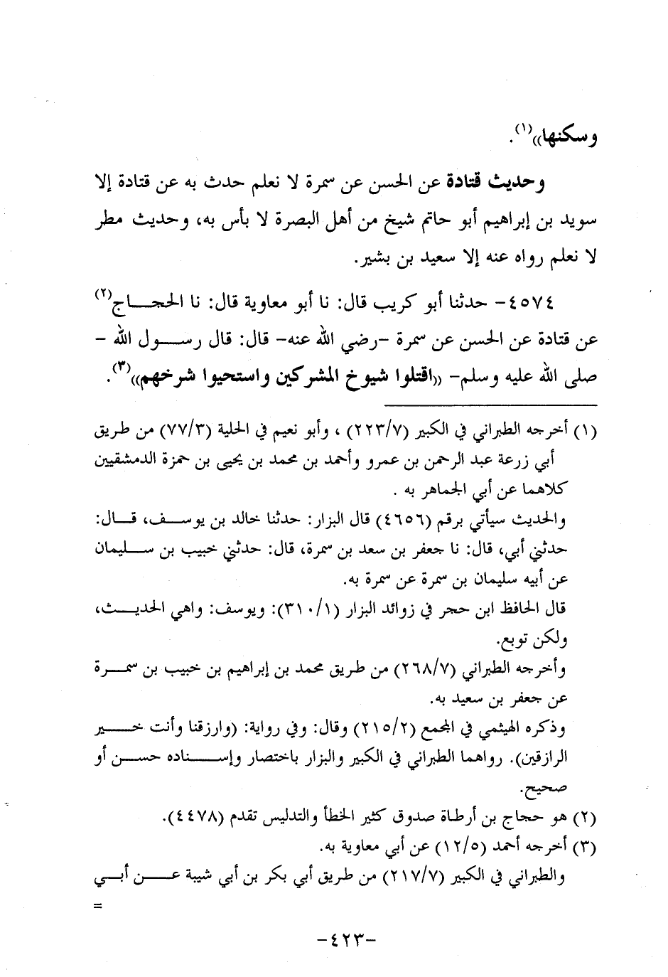 4574- حَدَّثنا أَبُو كُرَيب، قَال: حَدَّثنا أَبُو معاوية، قَال: حَدَّثنا الْحَجَّاجُ، عَنْ قَتَادَةَ، عَن الْحَسَنِ عَنْ سَمُرة، رَضِي اللَّهُ عَنْهُ، قَالَ: قَالَ رَسُول اللهِ صَلَّى اللَّهُ عَلَيه وَسَلَّم: اقْتُلُوا شُيُوخَ الْمُشْرِكِينَ وَاسْتَحْيُوا شَرْخَهُمْ.