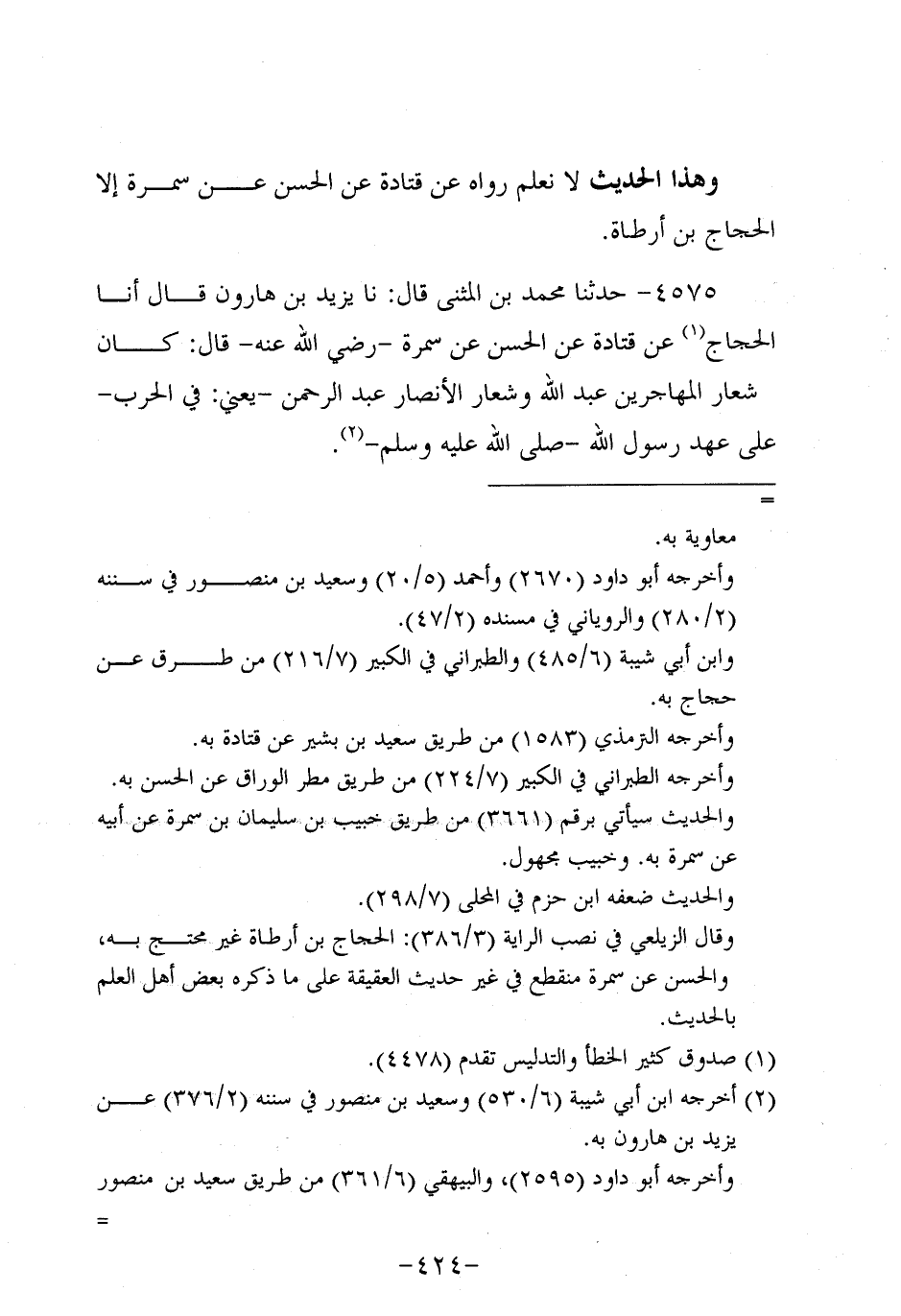 4575- حَدَّثنا مُحَمَّدُ بْنَ الْمُثَنَّى، قَال: حَدَّثنا يزيد بن هارون قال أَخْبَرَنَا الْحَجَّاجُ، عَنْ قَتَادَةَ، عَن الْحَسَنِ عَنْ سَمُرة، رَضِي اللَّهُ عَنْهُ، قَالَ: كَانَ شِعَارُ الْمُهَاجِرِينَ عَبد اللَّهِ وَشِعَارُ الأَنْصَارِ عَبد الرَّحْمَنِ، يَعْنِي: فِي الْحَرْبِ - عَلَى عَهْدِ رَسُولِ اللَّهِ صَلَّى اللَّهُ عَلَيه وَسَلَّم.