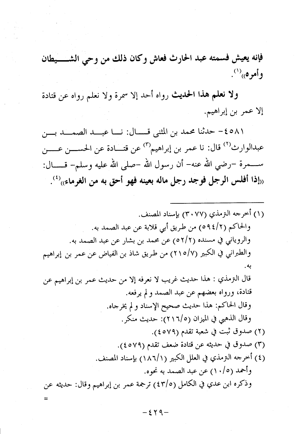 4581- حَدَّثنا مُحَمَّدُ بْنَ الْمُثَنَّى، قَال: حَدَّثنا عَبد الصمد بن عَبد الوارث، قَال: حَدَّثنا عُمَر بْنُ إِبْرَاهِيمَ، عَنْ قَتَادَةَ، عَن الْحَسَنِ عَنْ سَمُرة، رَضِي اللَّهُ عَنْهُ، أَنَّ رَسُولَ اللهِ صَلَّى اللَّهُ عَلَيه وَسَلَّم قَالَ: إِذَا أَفْلَسَ الرَّجُلُ فَوَجَدَ رَجُلٌ مَالَهُ بِعَيْنِهِ فَهُوَ أَحَقُّ بِهِ مِنَ الْغُرَمَاءِ.