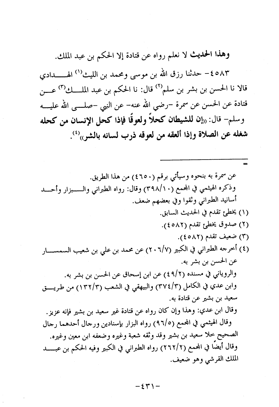4583- حَدَّثنا رِزْقُ اللَّهِ بْنُ مُوسَى، ومُحَمَّد بْنُ الليث الهدادي، قَالاَ: حَدَّثنَا الحسن بن بِشْر بن سلم، قَال: حَدَّثنا الْحَكَمُ بْنُ عَبد الْمَلِكِ، عَنْ قَتَادَةَ، عَن الْحَسَنِ عَنْ سَمُرة، رَضِي اللَّهُ عَنْهُ، عَنِ النَّبِيّ صَلَّى اللَّهُ عَلَيه وَسَلَّم قَالَ: إِنَّ لِلشَّيْطَانِ كُحْلا وَلَعُوقًا فَإِذَا كَحَّلَ الإِنْسَانَ مِنْ كُحْلِهِ شَغَلَهُ عَنِ الصَّلاةِ، وَإِذَا أَلْعَقَهُ مِنْ لَعُوقِهِ ذَرَبَ لِسَانُهُ بِالشَّرِّ.