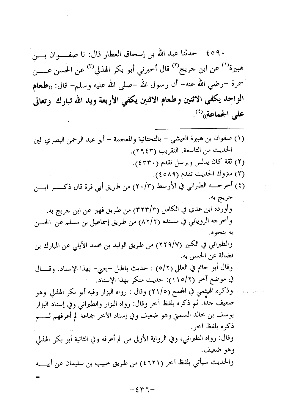 4590- حَدَّثنا عَبد اللَّهِ بْنُ إِسْحَاقَ الْعَطَّارُ، قَال: حَدَّثنا صَفْوَانُ بْنُ هُبَيْرَةَ، عَن ابْنِ جُرَيج، قَالَ أَخْبَرَنِي أَبُو بَكْرٍ الْهُذَلِيُّ عَنِ الْحَسَنِ عَنْ سَمُرة، رَضِي اللَّهُ عَنْهُ، أَنَّ رَسُولَ اللهِ صَلَّى اللَّهُ عَلَيه وَسَلَّم قَالَ: طَعَامُ الْوَاحِدِ يَكْفِي الاثْنَيْنِ وَطَعَامُ الاثْنَيْنِ يَكْفِي الأَرْبَعَةَ وَيَدُ اللَّهِ تَبَارَكَ وَتَعَالَى عَلَى الْجَمَاعَةِ.