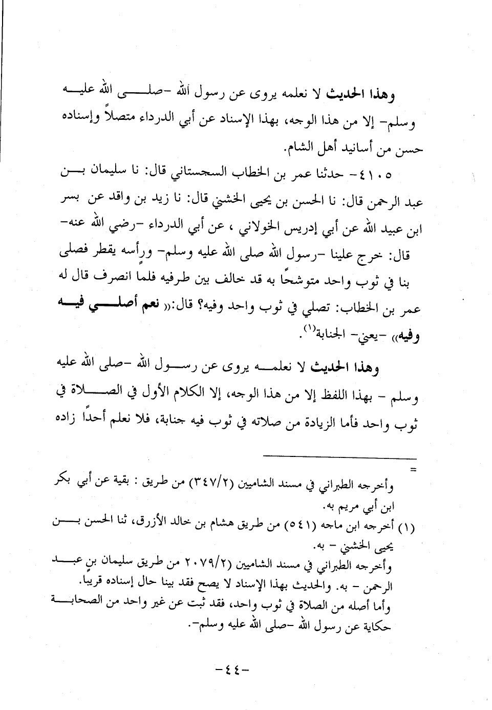 4105- حَدَّثنا عُمَر بن الخطاب السجستاني، قَال: حَدَّثنا سليمان بن عَبد الرحمن، قَال: حَدَّثنا الحسن بن يَحْيَى الخشني، قَال: حَدَّثنا زَيْدُ بْنُ وَاقِدٍ عَنْ بُسْرِ بْنِ عُبَيد اللَّهِ، عَن أَبِي إِدْرِيسَ الْخَوْلانِيِّ، عَن أَبِي الدَّرْدَاءِ، رَضِي اللَّهُ عَنْهُ، قَالَ: خَرَجَ عَلَيْنَا رسول الله صَلَّى اللَّهُ عَلَيه وَسَلَّم وَرَأْسُهُ يَقْطُرُ فَصَلَّى بِنَا فِي ثَوْبٍ وَاحِدٍ مُتَوَشِّحًا بِهِ قَدْ خَالَفَ بَيْنَ طَرَفَيْهِ فَلَمَّا انْصَرَفَ قَالَ لَهُ عُمَر بْنُ الْخَطَّابِ: تُصَلِّي فِي ثَوْبٍ وَاحِدٍ وَفِيهِ؟ قَالَ: نَعَمْ أُصَلِّي فِيهِ وَفِيهِ، يَعْنِي الْجَنَابَةَ.
