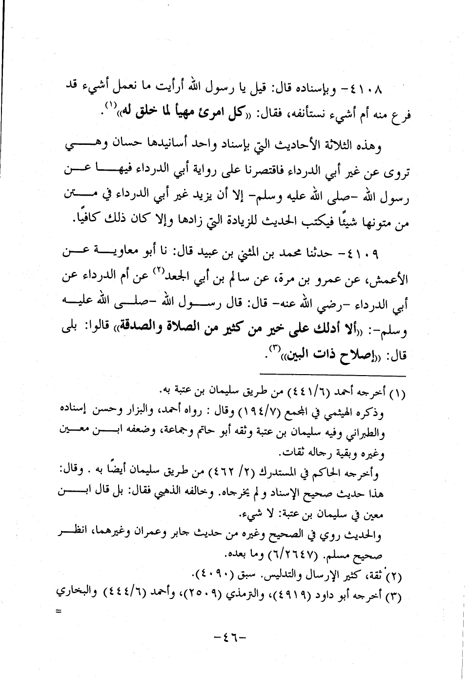 4109- حَدَّثنا مُحَمَّدُ بْنَ الْمُثَنَّى بْنِ عُبَيد، قَال: حَدَّثنا أَبُو مُعَاوِيَةَ عَنِ الأَعمَش، عَن عَمْرو بْنِ مُرَّةَ عَنْ سَالِمِ بْنِ أَبِي الْجَعْدِ عَنْ أُمُّ الدَّرْدَاءِ، عَن أَبِي الدَّرْدَاءِ، رَضِي اللَّهُ عَنْهُ، قَالَ: قَالَ رَسُول اللهِ صَلَّى اللَّهُ عَلَيه وَسَلَّم: أَلا أَدُلُّكَ عَلَى خَيْرٍ مِنْ كَثِيرٍ مِنَ الصَّلاةِ وَالصَّدَقَةِ قَالُوا: بَلَى قَالَ: إِصْلاحُ ذَاتِ الْبَيْنِ.