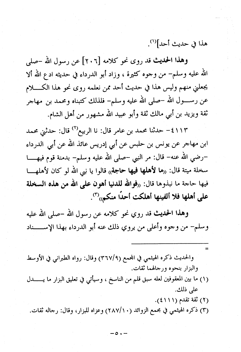 4113- حَدَّثنا مُحَمد بن عامر، قَال: حَدَّثنا الرَّبِيعُ، قَالَ: حَدَّثني مُحَمد بْنُ مُهَاجِرٍ عَنْ يُونُسَ بْنِ حَلْبَسٍ، عَن أَبِي إِدْرِيسَ عَائِذِ اللَّهِ، عَن أَبِي الدَّرْدَاءِ، رَضِي اللَّهُ عَنْهُ، قَالَ: مَرَّ النَّبِيّ صَلَّى اللَّهُ عَلَيه وَسَلَّم بِدِمْنَةِ قَوْمٍ فِيهَا سَخْلَةٌ مَيِّتَةٌ قَالَ: مَا لأهلها فيها حاجة قالوا يانبي اللَّهِ لَوْ كَانَ لأَهْلِهَا فِيهَا حَاجَةٌ مَا نَبَذُوهَا قَالَ: فَوَاللَّهِ لَلدُّنْيَا أَهْوَنُ عَلَى اللَّهِ مِنْ هَذِهِ السَّخْلَةِ عَلَى أَهْلِهَا فَلا أَلْفِيَنَّهَا أَهْلَكَتْ أَحَدًا مِنْكُمْ.