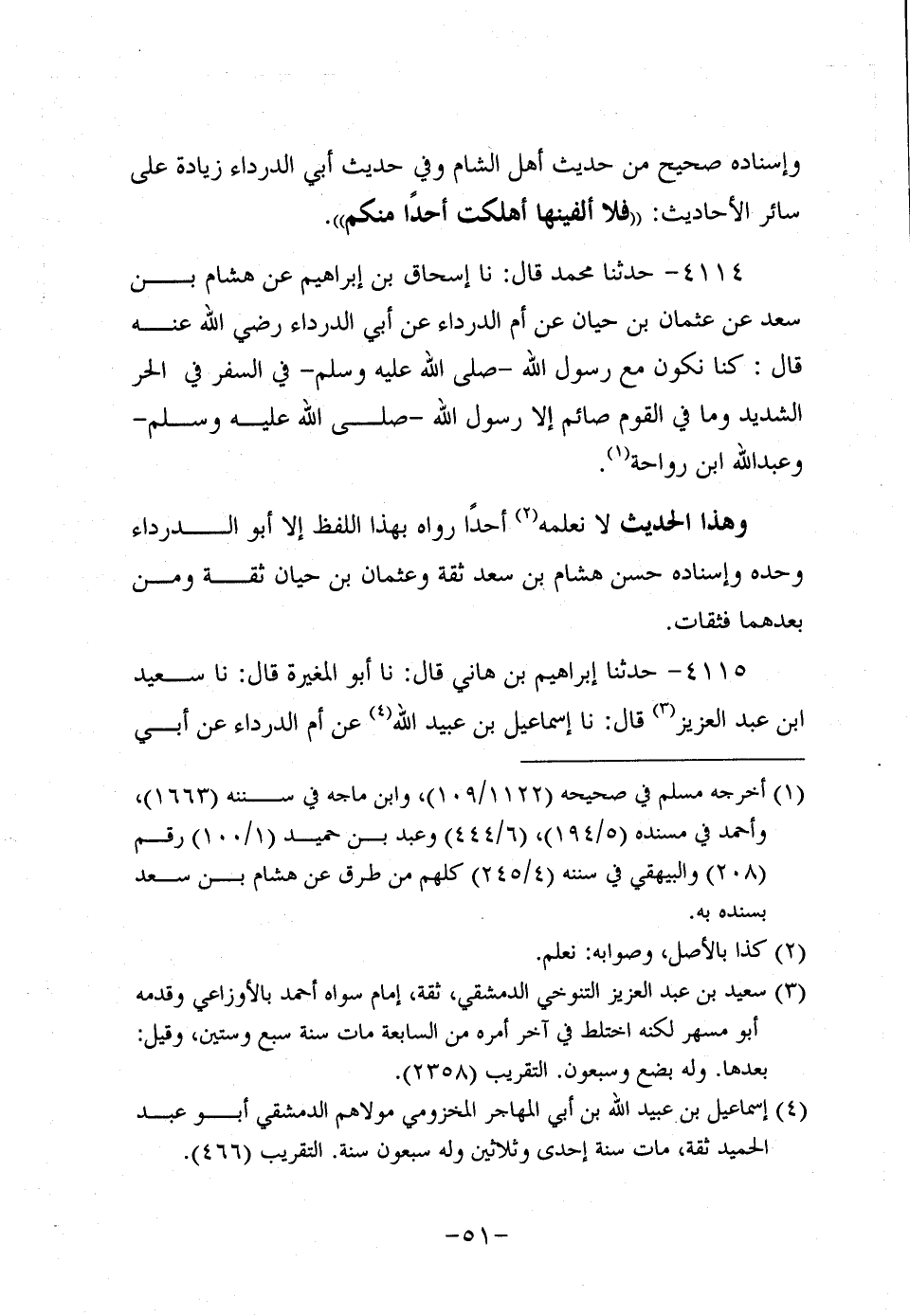 وهذا الحديث لا نعلمه أَحَدًا رَوَاهُ بِهَذَا اللَّفْظِ إلاَّ أَبُو الدَّرْدَاءِ وَحْدَهُ وَإِسْنَادُهُ حَسَنٌ هِشَامُ بْنُ سَعْد ثِقَةٌ وعُثمَان بْنُ حَيَّانَ ثِقَةٌ، وَمَنْ بَعْدَهُمَا فَثِقَاتٌ.