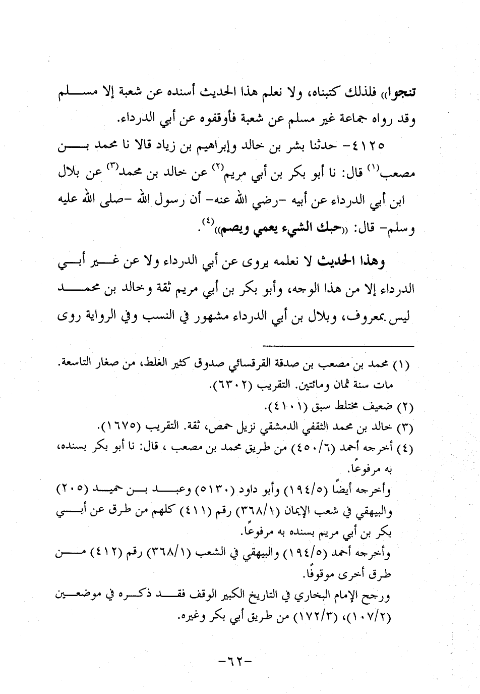 4125- حَدَّثنا بِشْر بْنُ خَالِدٍ وَإِبْرَاهِيمُ بْنُ زِيَادٍ، قَالاَ: حَدَّثنَا مُحَمد بن مصعب، قَال: حَدَّثنا أَبُو بَكْرِ بْنُ أَبِي مَرْيَمَ عَنْ خَالِدِ بْنِ مُحَمد، عَن بِلالِ بْنِ أَبِي الدَّرْدَاءِ، عَن أَبيهِ، رَضِي اللَّهُ عَنْهُ، أَنَّ رَسُولَ اللهِ صَلَّى اللَّهُ عَلَيه وَسَلَّم قَالَ: حُبُّكَ الشَّيْءَ يُعْمِي وَيُصِمُّ.