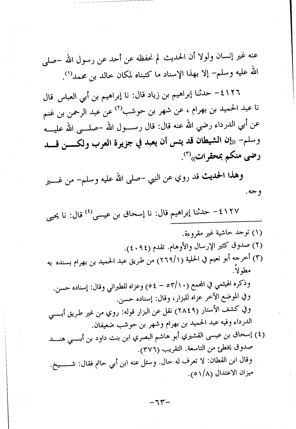 4126- حَدَّثنا إبراهيم بن زياد، قَال: حَدَّثنا إبراهيم بن أبي العباس، قَال: حَدَّثنا عَبد الْحَمِيدِ بْنُ بَهْرَامَ عَنْ شَهْرِ بْنِ حَوْشَبٍ عَنْ عَبد الرَّحْمَنِ بْنِ غَنْمٍ، عَن أَبِي الدَّرْدَاءِ، رَضِي اللَّهُ عَنْهُ، قَالَ: قَالَ رَسُول اللهِ صَلَّى اللَّهُ عَلَيه وَسَلَّم إِنَّ الشَّيْطَانَ قَدْ يَئِسَ أَنْ يُعْبَدَ فِي جَزِيرَةِ الْعَرَبِ، وَلكن قَدْ رَضِيَ مِنْكُمْ بِمُحَقِّرَاتٍ.