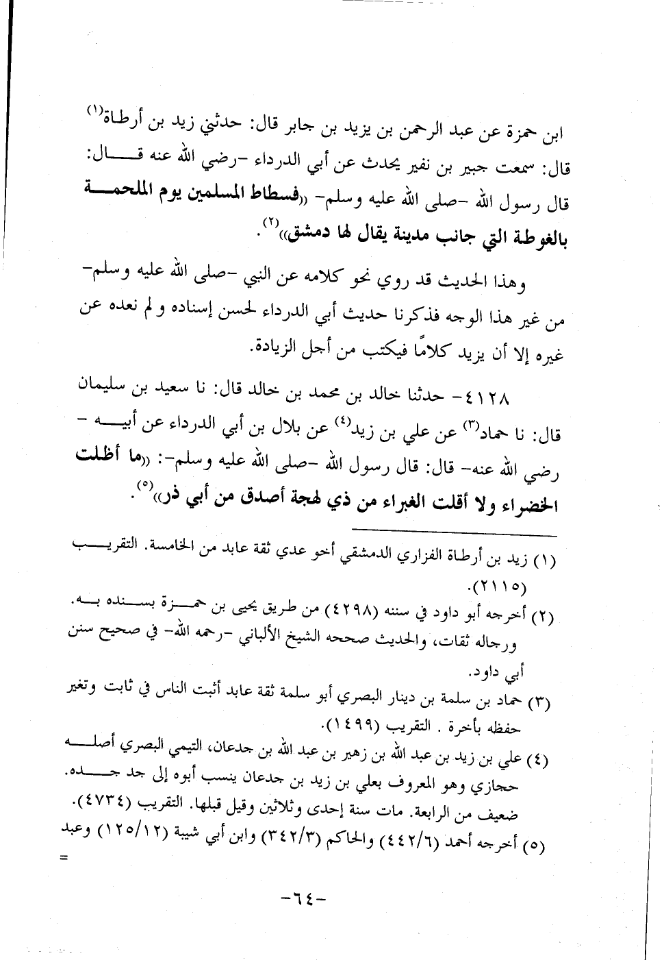 وَهَذَا الْحَدِيثُ قَدْ رُوِيَ عَن أَبِي الدَّرْدَاءِ مِنْ غَيْرِ هَذَا الْوَجْهِ فَذَكَرْنَا هَذَا الْحَدِيثَ لِعِزَّةِ إِسْنَادِهِ لأَنَّا لَمْ نَحْفَظْ، عَنْ عَلِيِّ بْنِ زَيْدٍ، عَن بِلالِ بْنِ أَبِي الدَّرْدَاءِ غَيْرَ هَذَا الْحَدِيثِ، ولاَ نَعْلَمُ حَدَّثَ بهذا الحديث، عَنْ عَلِيِّ بْنِ زَيْدٍ إلاَّ حَمَّادُ بْنُ سلمة.
