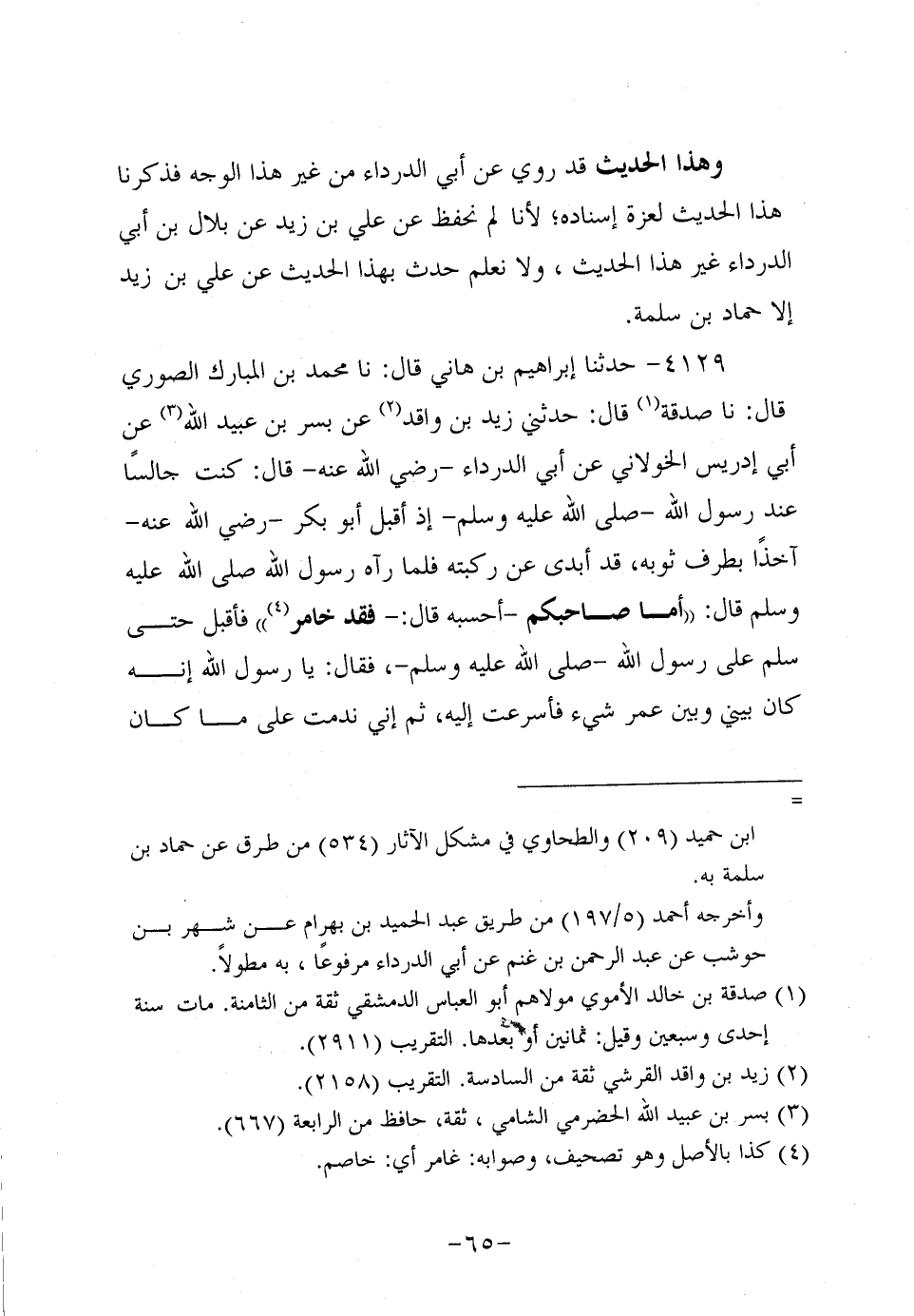 4129- حَدَّثنا إبراهيم بن هاني، قَال: حَدَّثنا مُحَمد بن المبارك الصوري، قَال: حَدَّثنا صَدَقَةُ، قَالَ: حَدَّثني زَيْدُ بْنُ وَاقِدٍ عَنْ بُسْرِ بْنِ عُبَيد اللَّهِ، عَن أَبِي إِدْرِيسَ الْخَوْلانِيِّ، عَن أَبِي الدَّرْدَاءِ، رَضِي اللَّهُ عَنْهُ، قَالَ: كُنْتُ جَالِسًا عِنْدَ رَسُولِ اللَّهِ صَلَّى اللَّهُ عَلَيه وَسَلَّم إِذْ أَقْبَلَ أَبُو بَكْرٍ، رَضِي اللَّهُ عَنْهُ، آخِذًا بِطَرَفِ ثَوْبِهِ قَدْ أَبْدَى عَنْ رُكْبَتِهِ فَلَمَّا رَآهُ رَسُولُ اللَّهِ صَلَّى اللَّهُ عَلَيه وَسَلَّم قَالَ: أَمَّا صَاحِبُكُمْ، أحسبه قال:- فقد خامر فَأَقْبَلَ حَتَّى سَلَّمَ عَلَى رَسُولِ اللَّهِ صَلَّى اللَّهُ عَلَيه وَسَلَّم فَقَالَ: يَا رَسولَ اللهِ إِنَّهُ كَانَ بَيْنِي وَبَيْنَ عُمَر شَيْءٌ فَأَسْرَعْتُ إِلَيْهِ، ثُمَّ إِنِّي نَدِمْتُ عَلَى مَا كَانَ فَسَأَلْتُهُ أَنْ يَغْفِرَ لِي فَأَبَى فَتَبِعْتُهُ إِلَى الْبَقِيعِ حَتَّى تَحَوَّزَ بِدَارِهِ مِنِّي فَأَقْبَلْتُ إِلَيْكَ فَقَالَ رَسُولُ اللَّهِ صَلَّى اللَّهُ عَلَيه وَسَلَّم: يَغْفِرُ اللَّهُ لَكَ أَبَا بَكْرٍ ثَلاثَ مِرَارٍ، ثُمَّ إِنَّ عُمَر نَدِمَ حِينَ سَأَلَهُ أَبُو بَكْرٍ أَنْ يَغْفِرَ لَهُ فَأَبَى عَلَيْهِ، ثُمَّ خَرَجَ مِنْ مَنْزِلِهِ حَتَّى أَتَى مَنْزِلَ أَبِي بَكْر فَسَأَلَ: هَلْ، ثُمَّ أَبُو بَكْرٍ؟ قَالُوا: لا نَعْلَمُ أَتَى رَسُولَ اللَّهِ صَلَّى اللَّهُ عَلَيه وَسَلَّم فَأَقْبَلَ عُمَر إِلَى رَسُولِ اللَّهِ صَلَّى اللَّهُ عَلَيه وَسَلَّم حَتَّى سَلَّمَ عَلَيْهِ فَجَعَلَ وَجْهُ رَسُولِ اللَّهِ صَلَّى اللَّهُ عَلَيه وَسَلَّم يَتَمَعَّرُ حَتَّى أَشْفَقَ أَبُو بَكْرٍ أَنْ يَكُونَ مِنْ رَسُولِ اللَّهِ صَلَّى اللَّهُ عَلَيه وَسَلَّم إِلَى عُمَر مَا يَكْرَهُ فَلَمَّا رَأَى ذلك أَبُو بكر جثى عَلَى رُكْبَتَيْهِ، وَقال أَنَا وَاللَّهِ يَا رَسولَ اللهِ كُنْتُ أَظْلَمَ فَقَالَ رَسُولُ اللَّهِ صَلَّى الله عَلَيه وَسَلَّم: ياأيها النَّاسُ إِنَّ اللَّهَ بَعَثَنِي إِلَيْكُمْ فَقُلْتُمْ كَذَبْتَ، وَقال أَبُو بَكْرٍ صَدَقْتَ فَوَاسَانِي بِنَفْسِهِ وَمَالِهِ فَهَلْ أَنْتُمْ تَارِكُو إِلَيَّ صَاحِبِي ثَلاثَ مِرَارٍ.