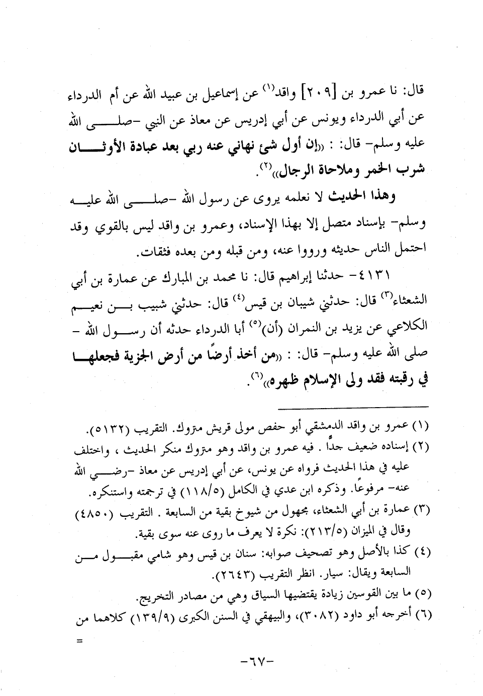 4131- حَدَّثنا إبراهيم، قَال: حَدَّثنا مُحَمد بْنُ الْمُبَارَكِ عَنْ عُمَارَةَ بْنِ أَبِي الشَّعْثَاءِ، قَالَ: حَدَّثني شَيْبَانُ بْنُ قَيْسٍ، قَالَ: حَدَّثني شَبِيب بْنُ نُعَيْمٍ الْكَلاعِيُّ عَنْ يَزِيدَ بْنِ النِّمْرَانِ أَنَّ أَبَا الدَّرْدَاءِ حَدَّثَهُ أَنَّ رَسُولَ اللهِ صَلَّى اللَّهُ عَلَيه وَسَلَّم قَالَ: مَنْ أَخَذَ أَرْضًا مِنْ أَرْضِ الْجِزْيَةِ فَجَعَلَهَا فِي رَقَبَتِهِ فَقَدْ وَلَّى الإِسْلامَ ظَهْرَهُ.