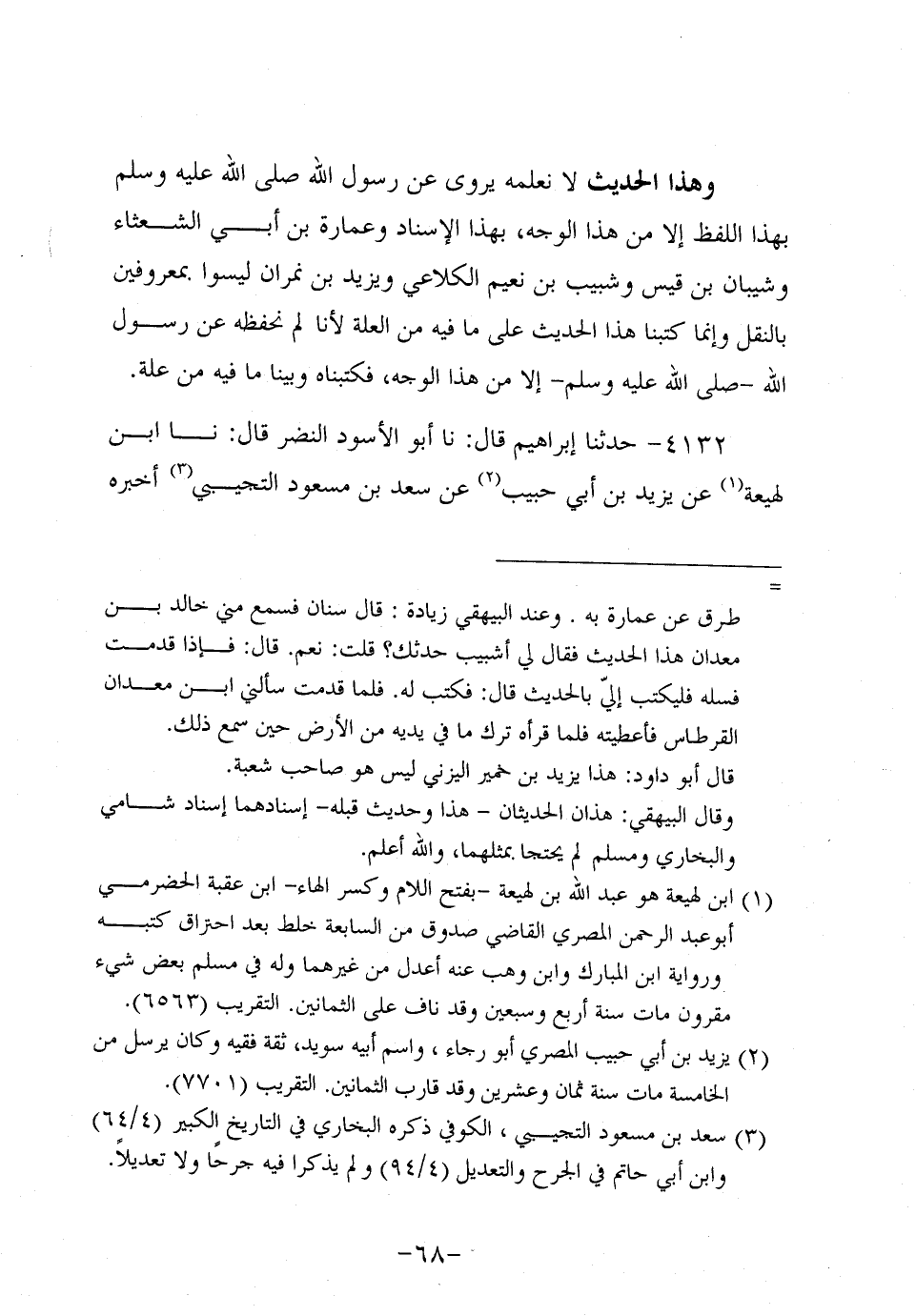 4132- حَدَّثنا إبراهيم، قَال: حَدَّثنا أَبُو الأسود النضر، قَال: حَدَّثنا ابْنُ لَهِيعَةَ عَنْ يَزِيدَ بْنِ أَبِي حَبِيبٍ، عَن سَعْد بْنِ مَسْعُودٍ التُّجِيبِيِّ أَخْبَرَهُ أَنَّهُ سَمِعَ عَبد اللَّهِ بْنَ جُبَير يُخْبِرُ: أَنَّهُ سَمِعَ أَبَا الدَّرْدَاءِ يُخْبِرُ أَنَّ رَسُولَ اللهِ صَلَّى اللَّهُ عَلَيه وَسَلَّم قَالَ: أَنَا أَوَّلُ مَنْ يُؤَذَّنُ لَهُ يَوْمَ الْقِيَامَةِ بِرَفْعِ رَأْسِهِ فَأَرْفَعُ رَأْسِي فَأَعْرِفُ أُمَّتِي عَنْ يَمِينِي، وعَن شِمَالِي قِيلَ: كَيْفَ تَعْرِفُهُمْ يَا رَسولَ اللهِ؟ قَالَ: غُرٌّ مُحَجَّلُونَ مِنَ الْوُضُوءِ وَذَرَارِيُّهُمْ نُورٌ بَيْنَ أَيْدِيهِمْ.