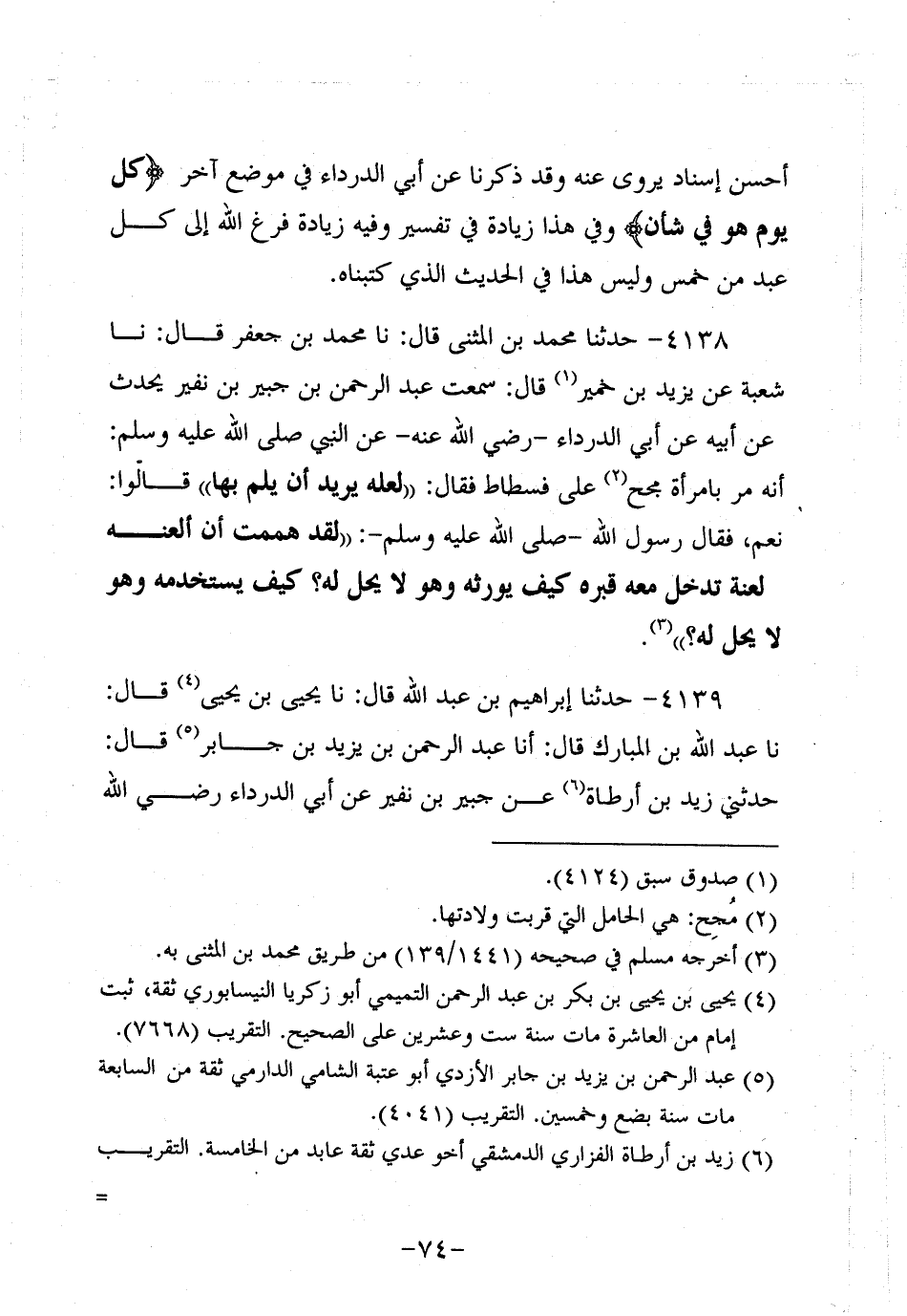 4138- حَدَّثنا مُحَمَّدُ بْنَ الْمُثَنَّى، قَال: حَدَّثنا مُحَمَّدُ بْنَ جَعْفَرٍ، قَال: حَدَّثنا شُعْبَةُ، عَن يَزِيدَ بْنِ خُمَيْرٍ، قَالَ: سَمِعْتُ عَبد الرَّحْمَنِ بْنَ جُبَير بْنِ نُفَيْرٍ يُحَدِّثُ، عَن أَبيهِ، عَن أَبِي الدَّرْدَاءِ، رَضِي اللَّهُ عَنْهُ، عَنِ النَّبِيّ صَلَّى اللَّهُ عَلَيه وَسَلَّم؛ أَنَّه مَرَّ بِامْرَأَةٍ مُجِحٍّ عَلَى فُسْطَاطٍ فَقَالَ: لَعَلَّهُ يُرِيدُ أَنْ يُلِمَّ بِهَا قَالُوا: نَعَمْ فَقَالَ رَسُولُ اللَّهِ صَلَّى اللَّهُ عَلَيه وَسَلَّم: لَقَدْ هَمَمْتُ أَنْ أَلْعَنَهُ لَعْنَةً تَدْخُلُ مَعَهُ قَبْرَهُ كَيْفَ يُوَرِّثُهُ، وهُو لا يَحِلُّ لَهُ؟ كَيْفَ يَسْتَخْدِمُهُ، وهُو لا يَحِلُّ لَهُ؟.