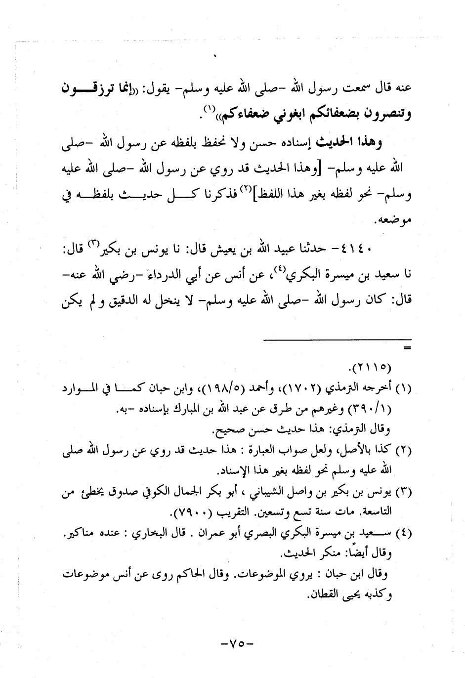 وَهَذَا الْحَدِيثُ لا نَعْلَمُهُ يُرْوَى عَن أَحَدٍ مِنْ أَصْحَابِ النَّبِيّ صَلَّى اللَّهُ عَلَيه وَسَلَّم بِهَذَا اللَّفْظِ إلاَّ عَن أَبِي الدَّرْدَاءِ بِهَذَا الإِسْنَادِ وَسَعِيدُ بْنُ مَيْسَرَةَ قَدْ حَدَّثَ عَنْهُ يُونُسُ بِأَحَادِيثَ لَمْ يُتَابَعْ عَلَيْهَا، وَقَدِ احْتَمَلَهَا أَهْلُ الْعِلْمِ عَلَى مَا فِيهَا.