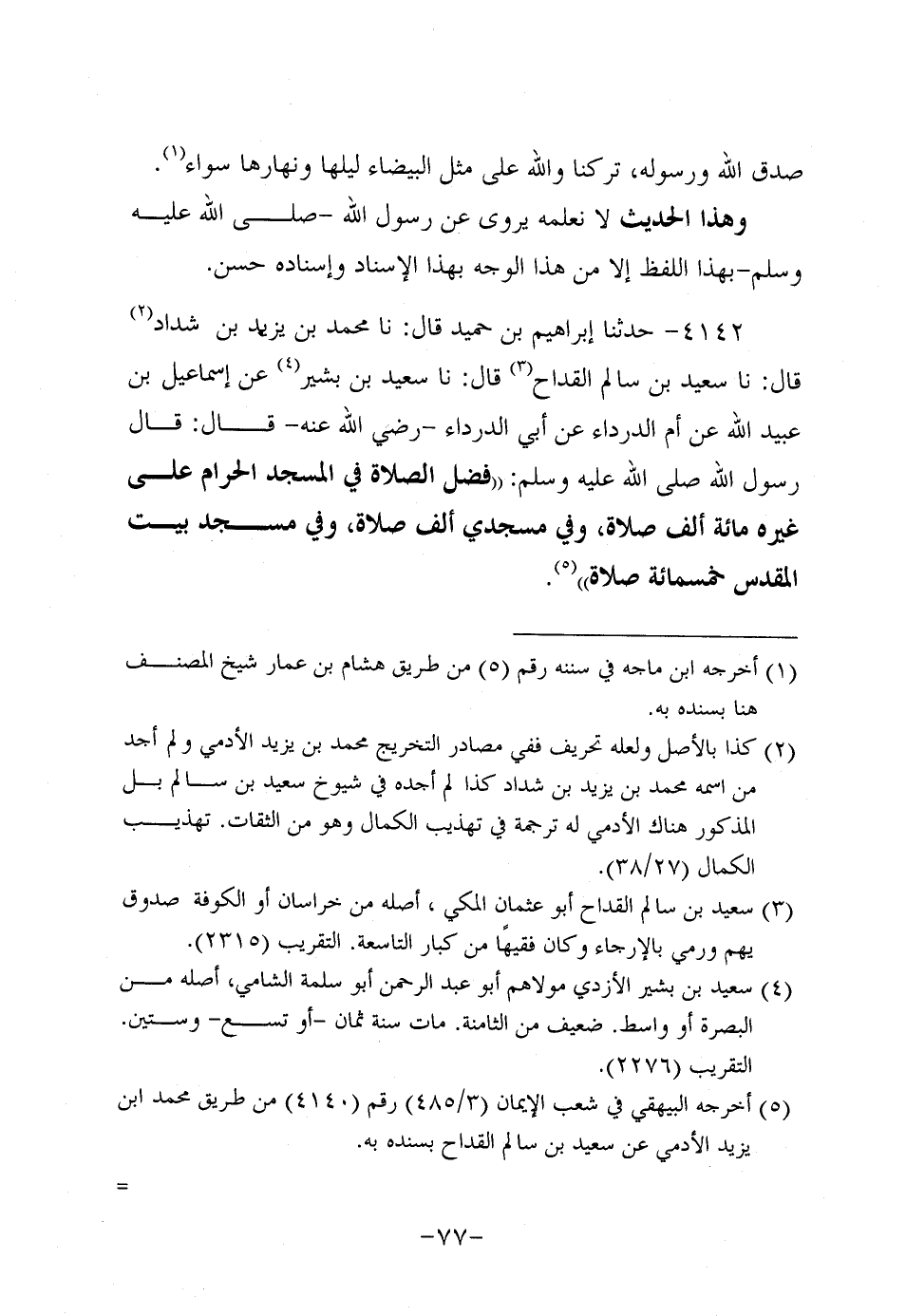 4142- حَدَّثنا إبراهيم بن حُمَيد، قَال: حَدَّثنا مُحَمد بن يزيد بن شداد، قَال: حَدَّثنا سَعِيد بن سالم القداح، قَال: حَدَّثنا سَعِيد بْنُ بَشِيرٍ عَنْ إِسْمَاعِيلَ بْنِ عُبَيد اللَّهِ، عَن أُمِّ الدَّرْدَاءِ، عَن أَبِي الدَّرْدَاءِ، رَضِي اللَّهُ عَنْهُ، قَالَ: قَالَ رَسُول اللهِ صَلَّى اللَّهُ عَلَيه وَسَلَّم: فَضْلُ الصَّلاةِ فِي المسجد الحرام على غيره مِئَة أَلْفِ صَلاةٍ وَفِي مَسْجِدِي أَلْفُ صَلاةٍ وَفِي مسجد بيت المقدس خمسمِئَة صَلاةٍ.