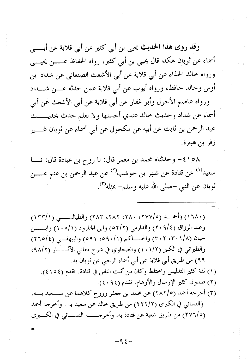 4157- وحَدَّثنا الْجَرَّاحُ بْنُ مَخْلَدٍ، قَال: حَدَّثنا زفر بن هبيرة، قَال: حَدَّثنا عَبد الرَّحْمَنِ بْنُ ثَابِتِ بْنِ ثَوْبَانَ، عَن أَبيهِ، عَن مَكْحُولٍ، عَن أَبِي أَسْمَاءَ عَنْ ثَوبان، عَن النَّبِيّ صَلَّى اللَّهُ عَلَيه وَسَلَّم.