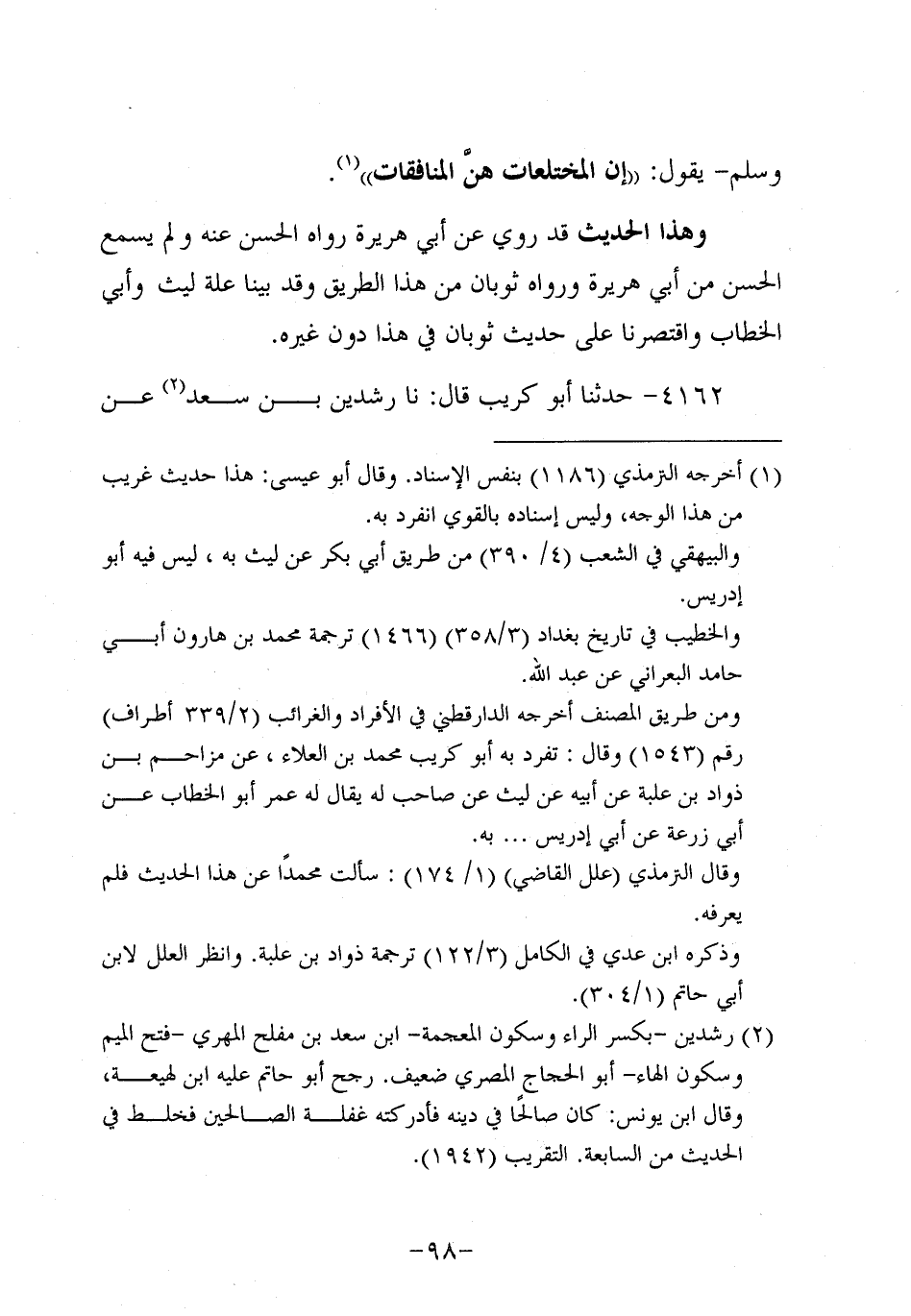 4161- حَدَّثنا أَبُو كُرَيب، قَال: حَدَّثنا مزاحم بن ذاود بْنِ عُلْبَةَ، عَن أَبيهِ، عَن لَيْثٍ، عَن صَاحِبٍ لَهُ يُقَالُ لَهُ: أَبُو الْخَطَّابِ، عَن أَبِي زُرْعَةَ، عَن أَبِي إِدْرِيسَ عَنْ ثَوْبَانَ، رَضِي اللَّهُ عَنْهُ، أَنَّهُ سَمِعَ النَّبِيّ صَلَّى اللَّهُ عَلَيه وَسَلَّم يَقُولُ: إِنَّ الْمُخْتَلِعَاتِ هُنَّ الْمُنَافِقَاتُ.