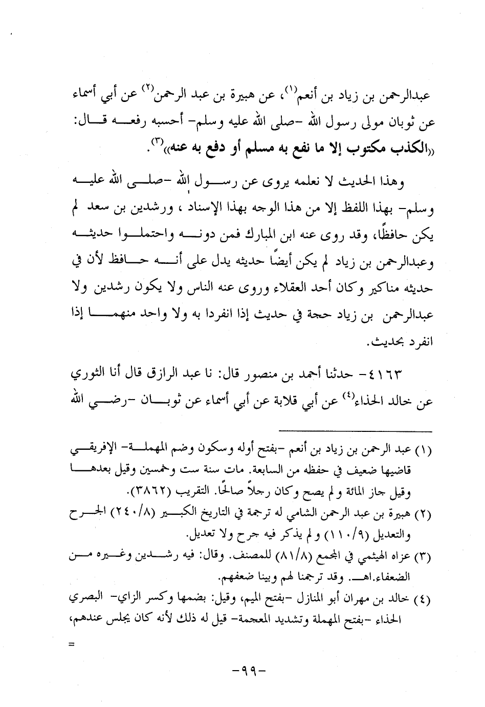 4162- حَدَّثنا أَبُو كُرَيب، قَال: حَدَّثنا رِشْدِينُ بْنُ سَعْد عَنْ عَبد الرَّحْمَنِ بْنِ زِيَادِ بْنِ أَنْعُمٍ عَنْ هُبَيْرَةَ بْنِ عَبد الرَّحْمَنِ، عَن أَبِي أَسْمَاءَ عَنْ ثَوْبَانَ مَوْلَى رَسُولِ اللَّهِ صَلَّى اللَّهُ عَلَيه وَسَلَّم أَحْسَبُهُ رَفَعَهُ قَالَ: الْكَذِبُ مَكْتُوبٌ إلاَّ مَا نُفِعَ بِهِ مُسْلِمٌ، أَوْ دَفَعَ بِهِ عَنْهُ.