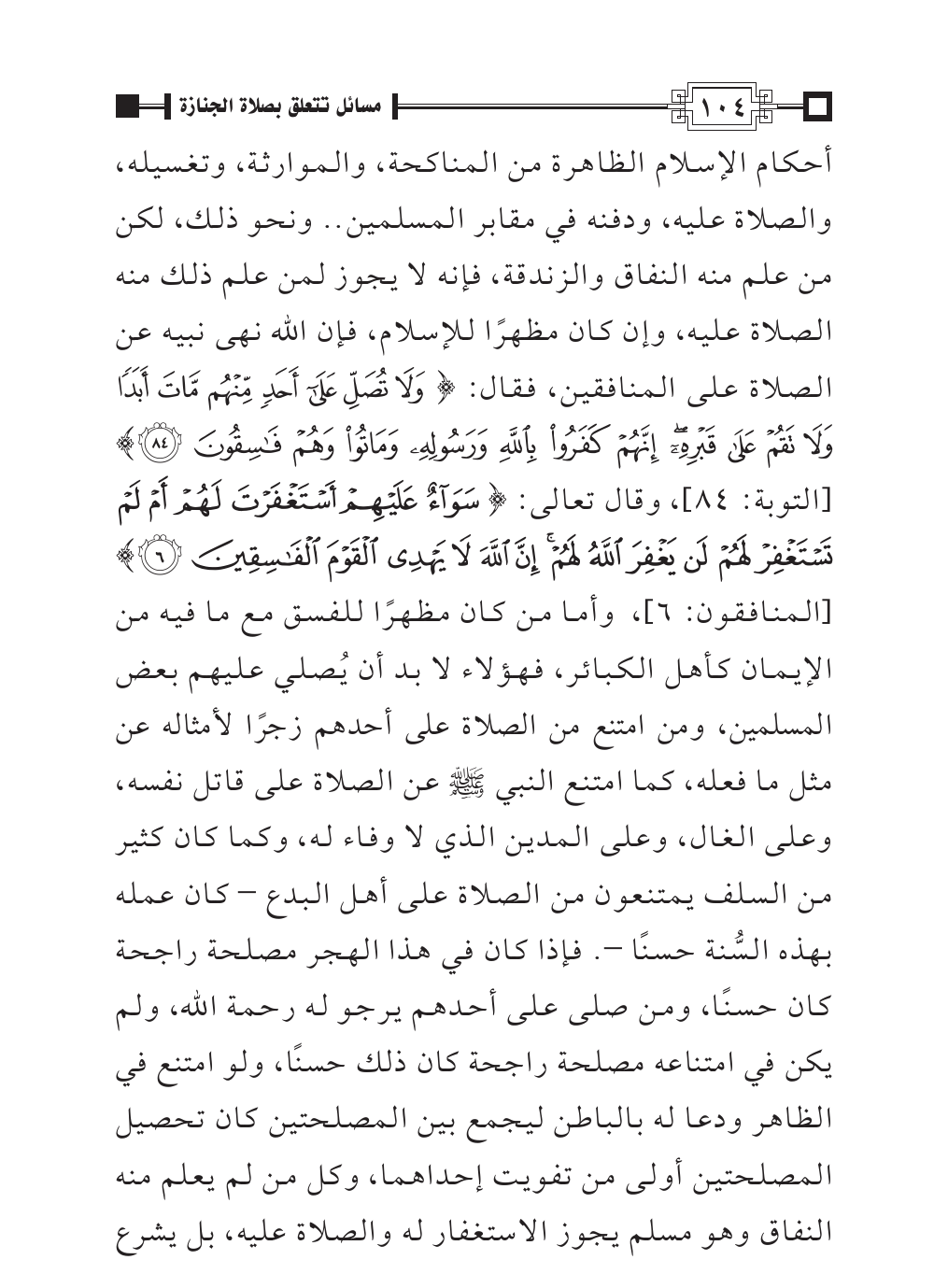 أحكام الإسلام الظاهرة من المناكحة، والموارثة، وتغسيله، والصلاة عليه، ودفنه في مقابر المسلمين .. ونحو ذلك، لكن من علم منه النفاق والزندقة، فإنه لا يجوز لمن علم ذلك منه الصلاة عليه، وإن كان مظهرًا للإسلام، فإن الله نهى نبيه عن الصلاة على المنافقين، فقال: {وَلَا تُصَلِّ عَلَى أَحَدٍ مِنْهُمْ مَاتَ أَبَدًا وَلَا تَقُمْ عَلَى قَبْرِهِ إِنَّهُمْ كَفَرُوا بِاللَّهِ وَرَسُولِهِ وَمَاتُوا وَهُمْ فَاسِقُونَ (٨٤)} [التوبة: ٨٤]، وقال تعالى: {سَوَاءٌ عَلَيْهِمْ أَسْتَغْفَرْتَ لَهُمْ أَمْ لَمْ تَسْتَغْفِرْ لَهُمْ لَنْ يَغْفِرَ اللَّهُ لَهُمْ إِنَّ اللَّهَ لَا يَهْدِي الْقَوْمَ الْفَاسِقِينَ (٦)} [المنافقون: ٦]، وأما من كان مظهرًا للفسق مع ما فيه من الإيمان كأهل الكبائر، فهؤلاء لا بد أن يُصلي عليهم بعض المسلمين، ومن امتنع من الصلاة على أحدهم زجرًا لأمثاله عن مثل ما فعله، كما امتنع النبي - صلى الله عليه وسلم - عن الصلاة على قاتل نفسه، وعلى الغال، وعلى المدين الذي لا وفاء له، وكما كان كثير من السلف يمتنعون من الصلاة على أهل البدع - كان عمله بهذه السُّنة حسنًا -. فإذا كان في هذا الهجر مصلحة راجحة كان حسنًا، ومن صلى على أحدهم يرجو له رحمة الله، ولم يكن في امتناعه مصلحة راجحة كان ذلك حسنًا، ولو امتنع في الظاهر ودعا له بالباطن ليجمع بين المصلحتين كان تحصيل المصلحتين أولى من تفويت إحداهما، وكل من لم يعلم منه النفاق وهو مسلم يجوز الاستغفار له والصلاة عليه، بل يشرع