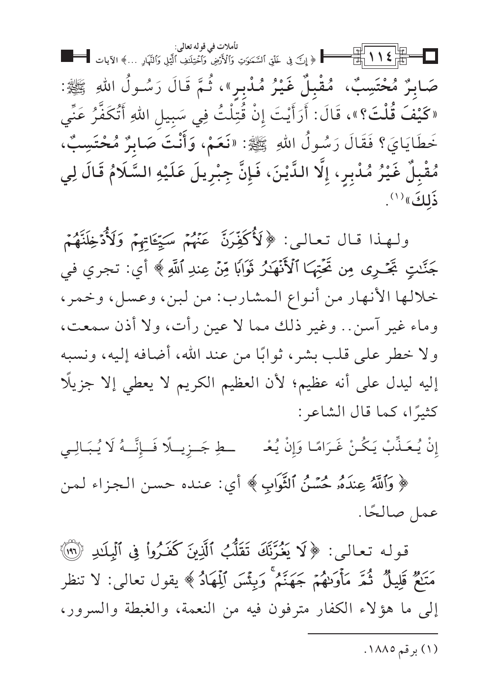 صَابِرٌ مُحْتَسِبٌ، مُقْبِلٌ غَيْرُ مُدْبِرٍ»، ثُمَّ قَالَ رَسُولُ اللهِ - صلى الله عليه وسلم -: «كَيْفَ قُلْتَ؟»، قَالَ: أَرَأَيْتَ إِنْ قُتِلْتُ فِي سَبِيلِ اللهِ أَتُكَفَّرُ عَنِّي خَطَايَايَ؟ فَقَالَ رَسُولُ اللهِ - صلى الله عليه وسلم -: «نَعَمْ، وَأَنْتَ صَابِرٌ مُحْتَسِبٌ، مُقْبِلٌ غَيْرُ مُدْبِرٍ، إِلَّا الدَّيْنَ، فَإِنَّ جِبْرِيلَ عَلَيْهِ السَّلَامُ قَالَ لِي ذَلِكَ» (¬١).