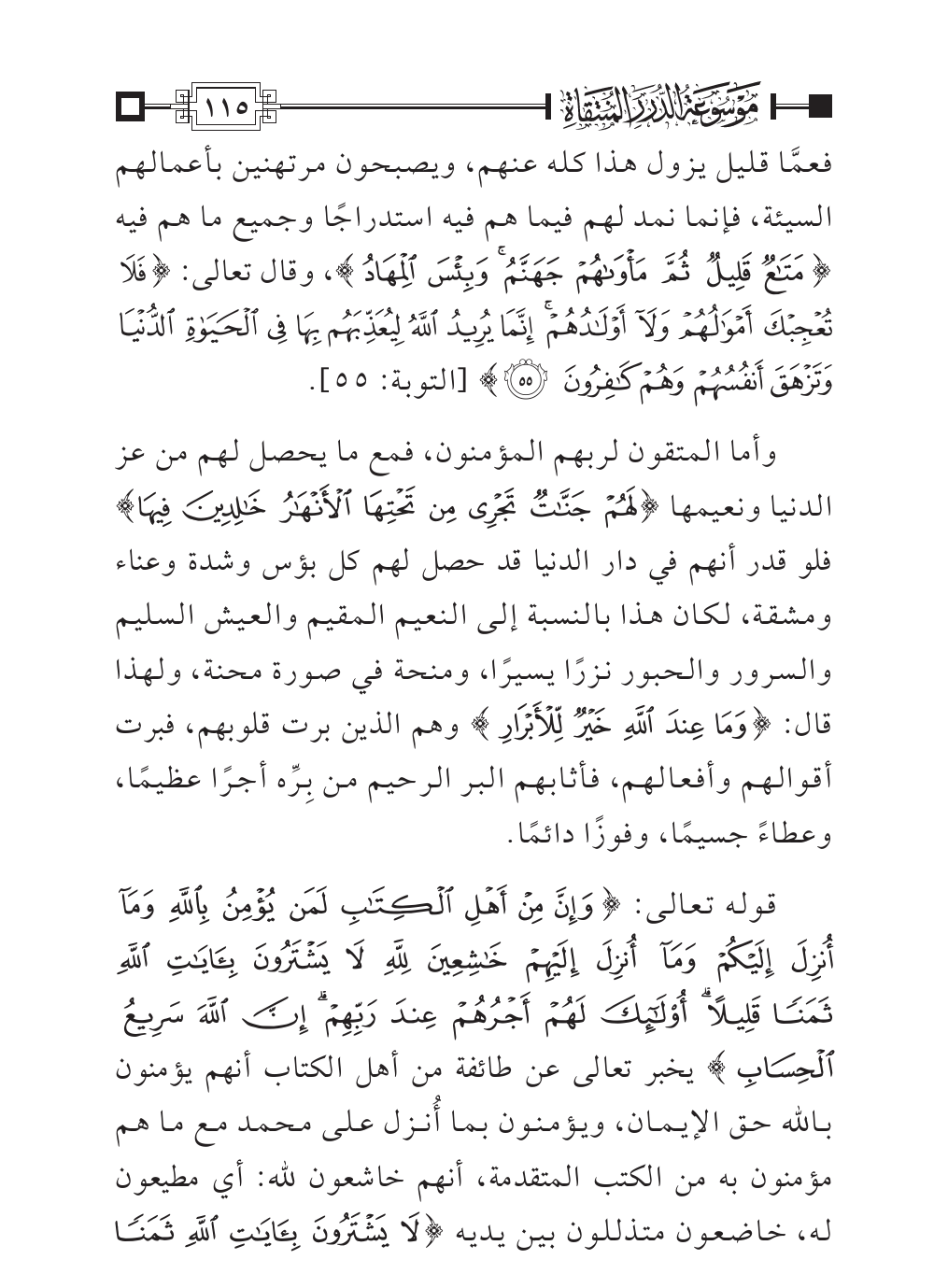 قوله تعالى: {وَإِنَّ مِنْ أَهْلِ الْكِتَابِ لَمَنْ يُؤْمِنُ بِاللَّهِ وَمَا أُنْزِلَ إِلَيْكُمْ وَمَا أُنْزِلَ إِلَيْهِمْ خَاشِعِينَ لِلَّهِ لَا يَشْتَرُونَ بِآيَاتِ اللَّهِ ثَمَنًا قَلِيلًا أُولَئِكَ لَهُمْ أَجْرُهُمْ عِنْدَ رَبِّهِمْ إِنَّ اللَّهَ سَرِيعُ الْحِسَابِ} يخبر تعالى عن طائفة من أهل الكتاب أنهم يؤمنون بالله حق الإيمان، ويؤمنون بما أُنزل على محمد مع ما هم مؤمنون به من الكتب المتقدمة، أنهم خاشعون لله: أي مطيعون له، خاضعون متذللون بين يديه {لَا يَشْتَرُونَ بِآيَاتِ اللَّهِ ثَمَنًا