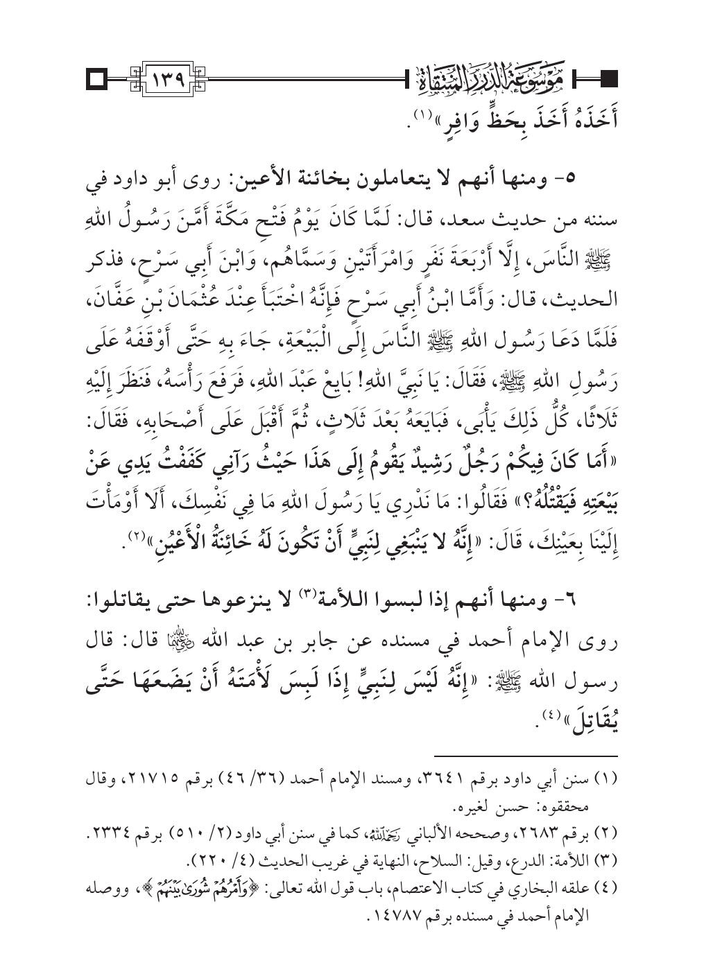 ٦ - ومنها أنهم إذا لبسوا اللأمة (¬٣) لا ينزعوها حتى يقاتلوا: روى الإمام أحمد في مسنده عن جابر بن عبد الله - رضي الله عنهما- قال: قال رسول الله - صلى الله عليه وسلم -: «إِنَّهُ لَيْسَ لِنَبِيٍّ إِذَا لَبِسَ لَأْمَتَهُ أَنْ يَضَعَهَا حَتَّى يُقَاتِلَ» (¬٤).